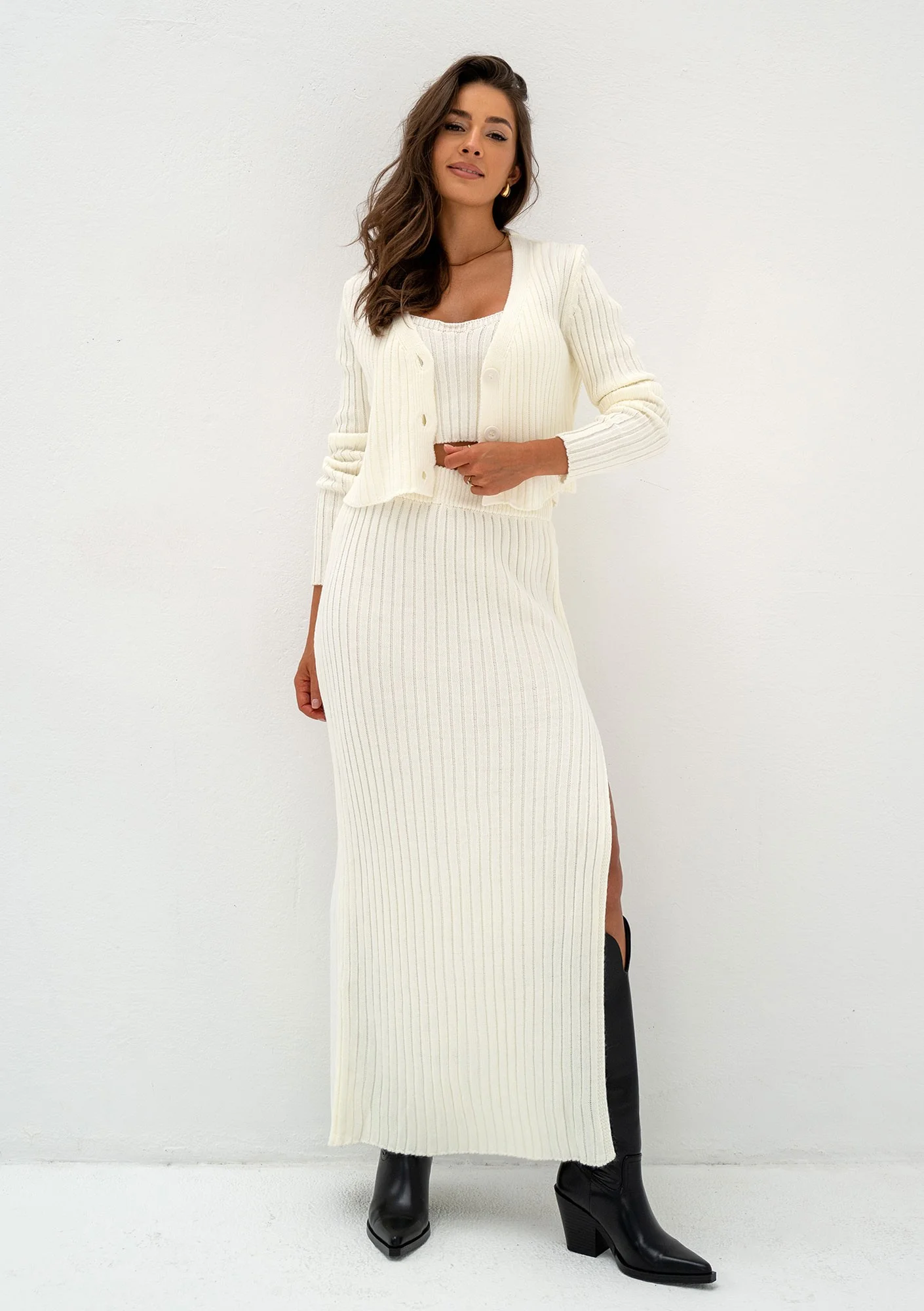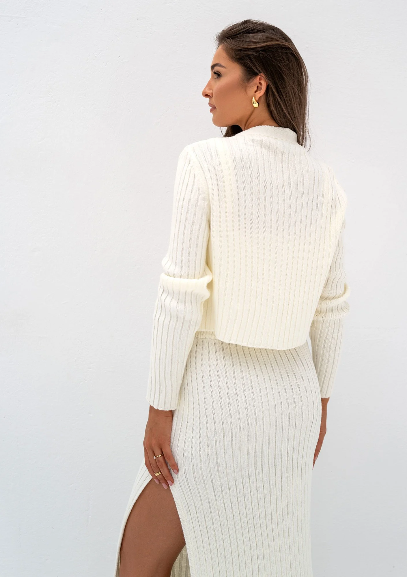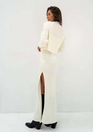 Pełna uniwersalność naszego kardiganu pozwala na tworzenie różnorodnych stylizacji, od casualowych po bardziej eleganckie. Miękki i ciepły model z dzianiny akrylowej możesz zestawić z dedykowanymi elementami - krótkim topem i spódnicą maxi z rozcięciem, wykonanymi z tego samego materiału.
