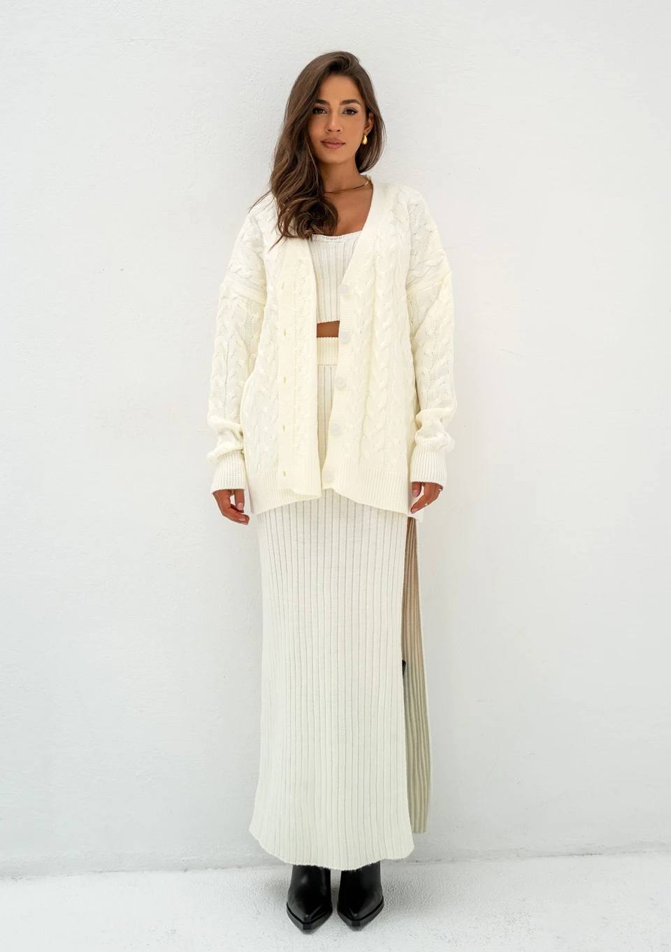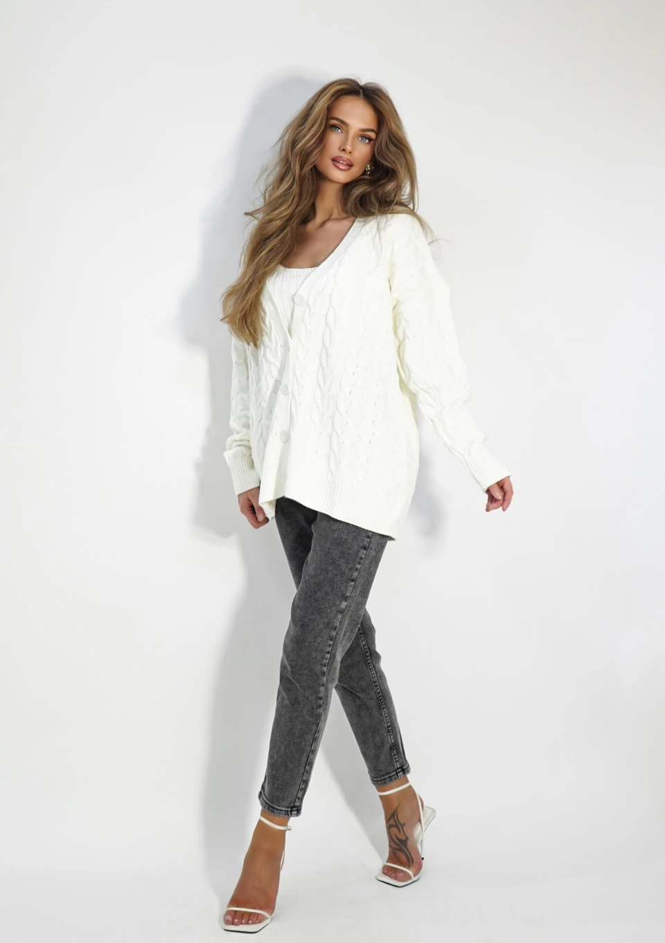 Modny kardigan damski oversize z pięknym splotem w kłosy. Wygodnie zapinany na guziki, wykonany z miękkiej włóczki akrylowej w odcieniu ecru.