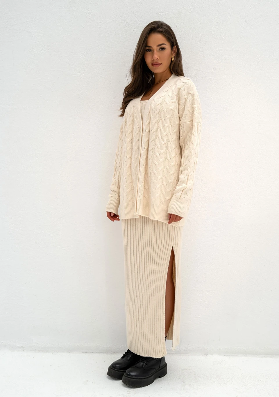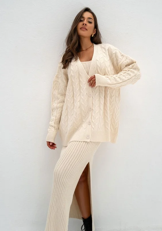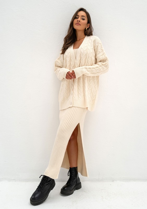 Szlachetnie splatany kardigan damski oversize o długim kroju. Wygodnie zapinany na guziki, wykonany z miękkich włókien akrylowych w beżowym kolorze.