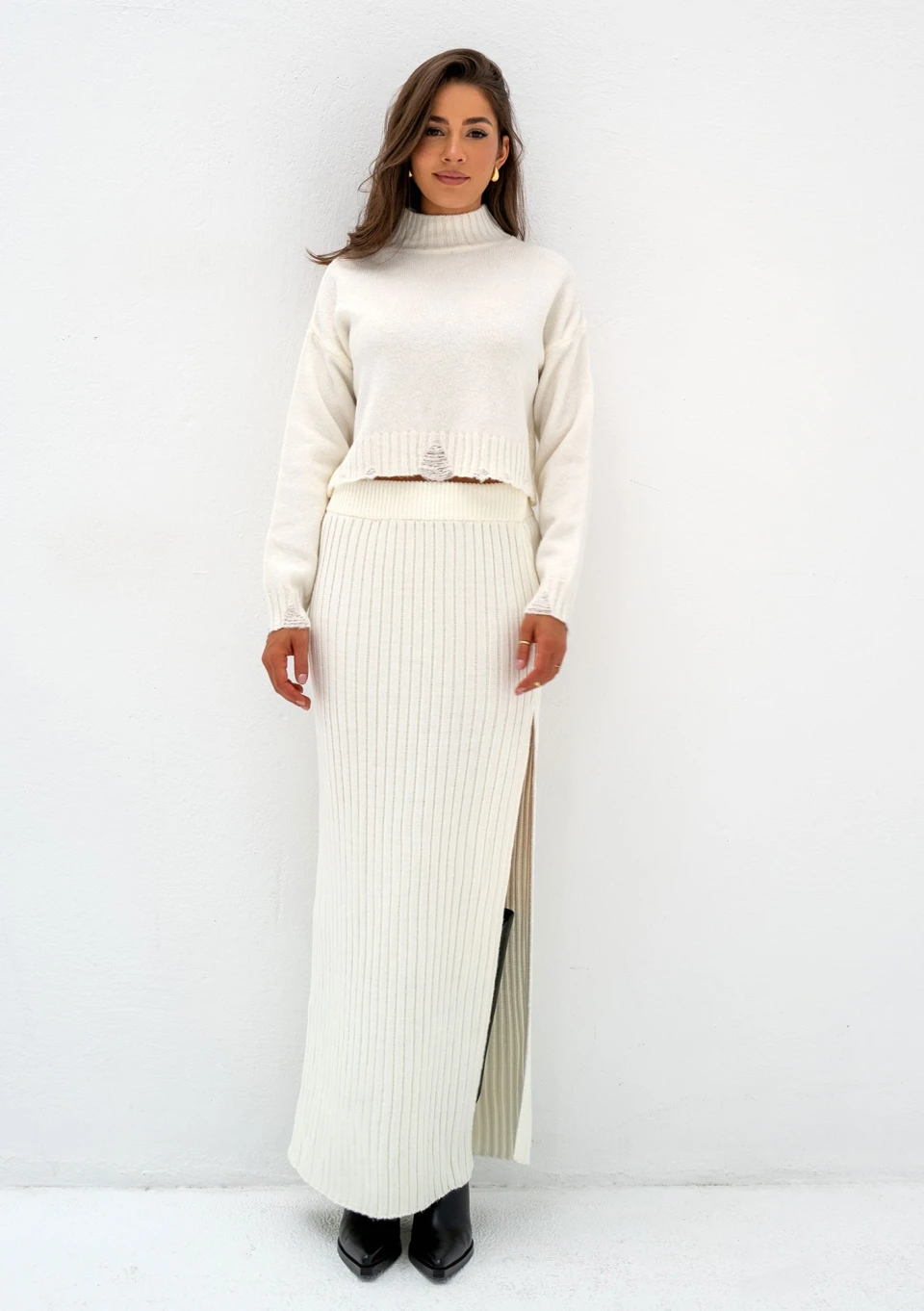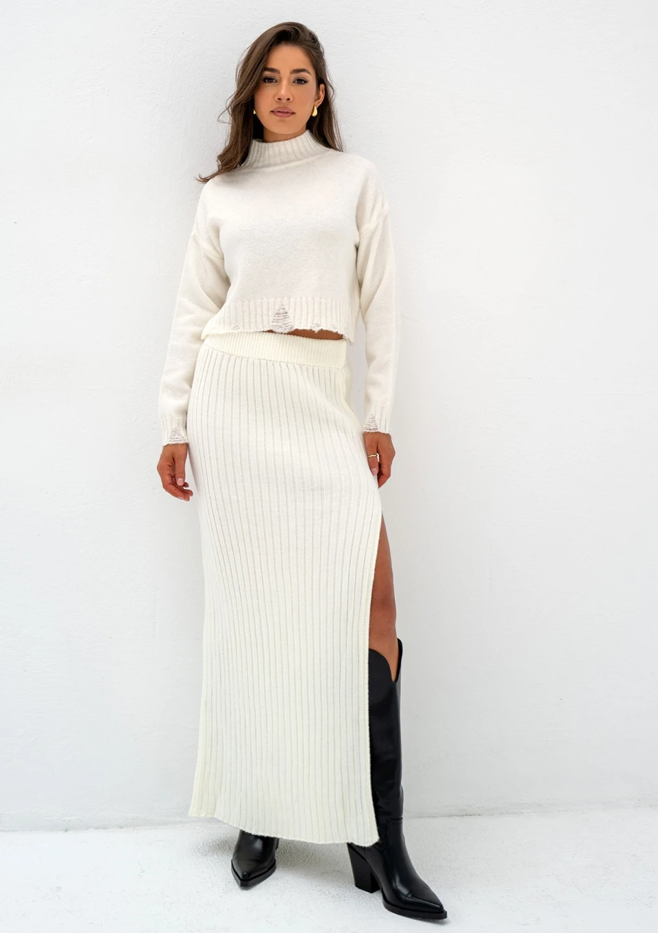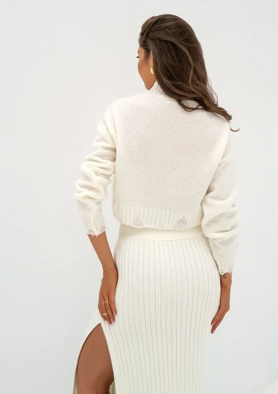 Krótki sweterek z golfem w uniwersalnym odcieniu ecru. Wykonany z miękkiej dzianiny, ozdobnie pruty.