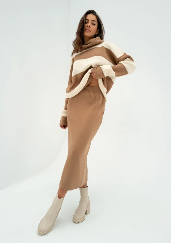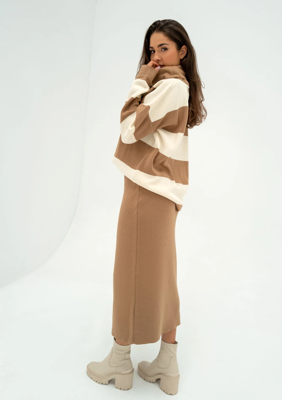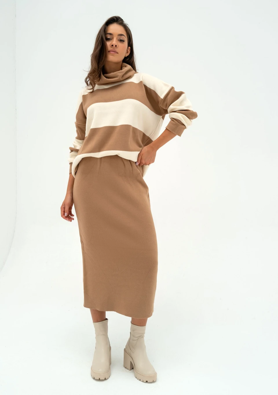 Komplety dzianinowe to w jesienno - zimowej porze jedno z najpraktyczniejszych rozwiązań. Każdego ranka zaoszczędzisz czas mając gotową, pasującą do siebie elementami stylizację. Podstawą takiego ubioru może być ten ponadczasowy sweter damski z golfem o luźnym kroju. Prosty, wygodny model został wykonany z miękkiej i optymalnie grzejącej dzianiny w kolorze ecru i kamelowym. Wzór w paski urozmaici każdy look, a jednocześnie wpisuje się w bardzo uniwersalny i zawsze modny kanon. Prezentowany sweter damski możesz połączyć w zestaw z dedykowaną spódnicą Mishy.