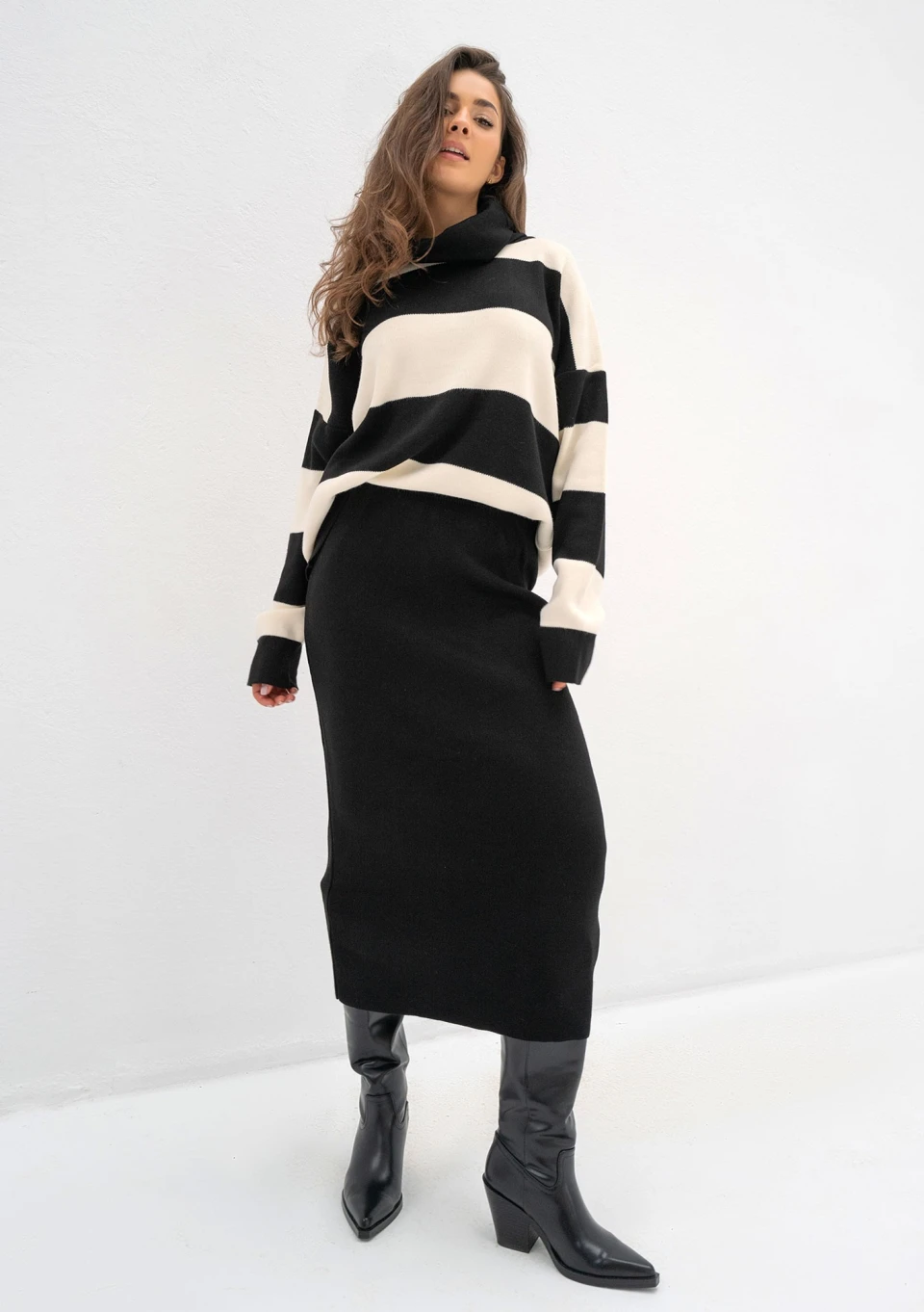 Komplety dzianinowe to w jesienno - zimowej porze jedno z najpraktyczniejszych rozwiązań. Każdego ranka zaoszczędzisz czas mając gotową, pasującą do siebie elementami stylizację. Podstawą takiego ubioru może być ten ponadczasowy sweter damski z golfem o luźnym kroju. Prosty, wygodny model został wykonany z miękkiej i optymalnie grzejącej dzianiny w kolorze ecru i czarnym. Wzór w paski urozmaici każdy look, a jednocześnie wpisuje się w bardzo uniwersalny i zawsze modny kanon. Prezentowany sweter damski możesz połączyć w zestaw z dedykowaną spódnicą Mishy.