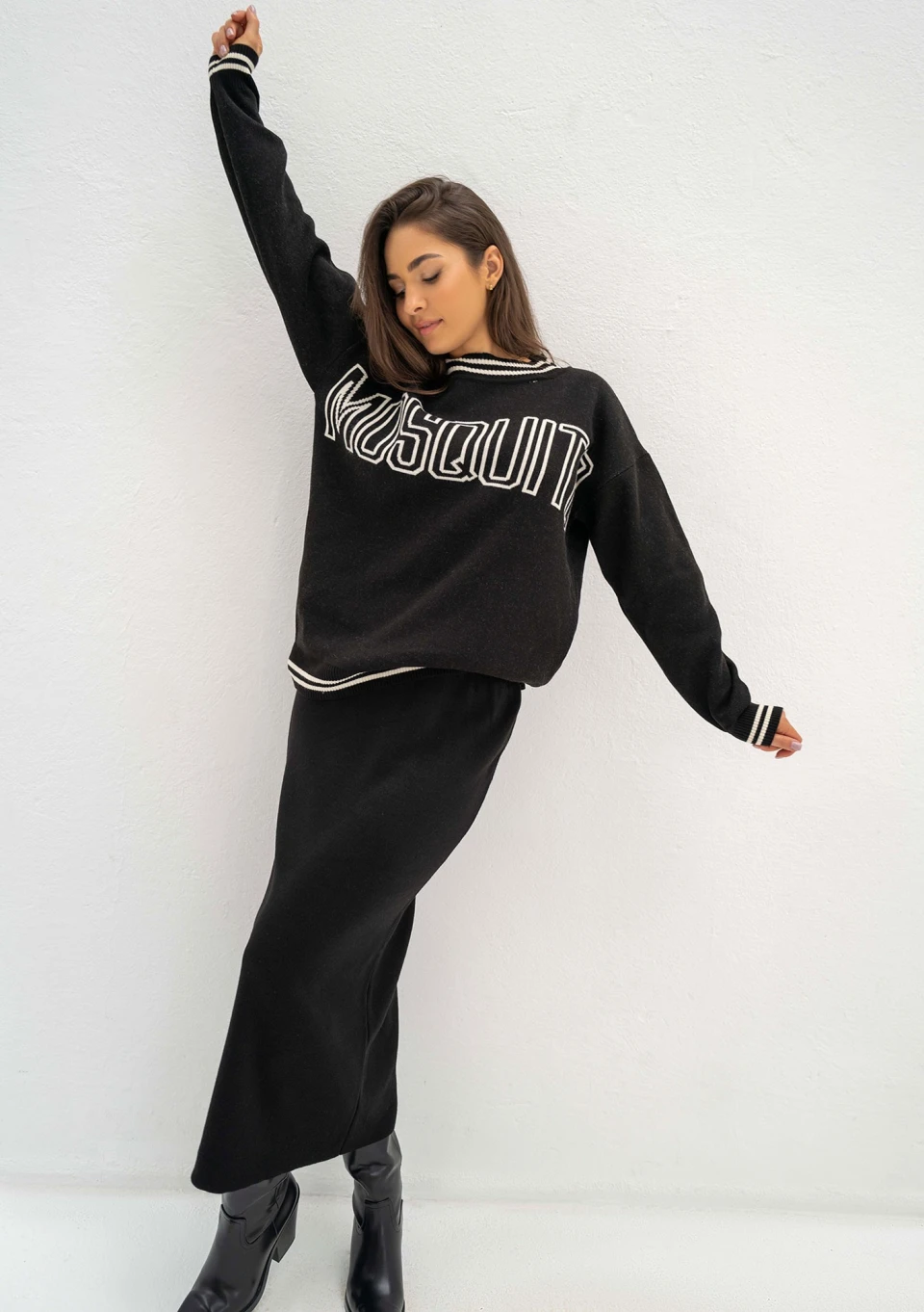 Luźny, wygodny sweter damski wykończony ściągaczami o wzorze pasków. Dzianinę zdobi napis ,,Mosquito". Model w czarnym kolorze.