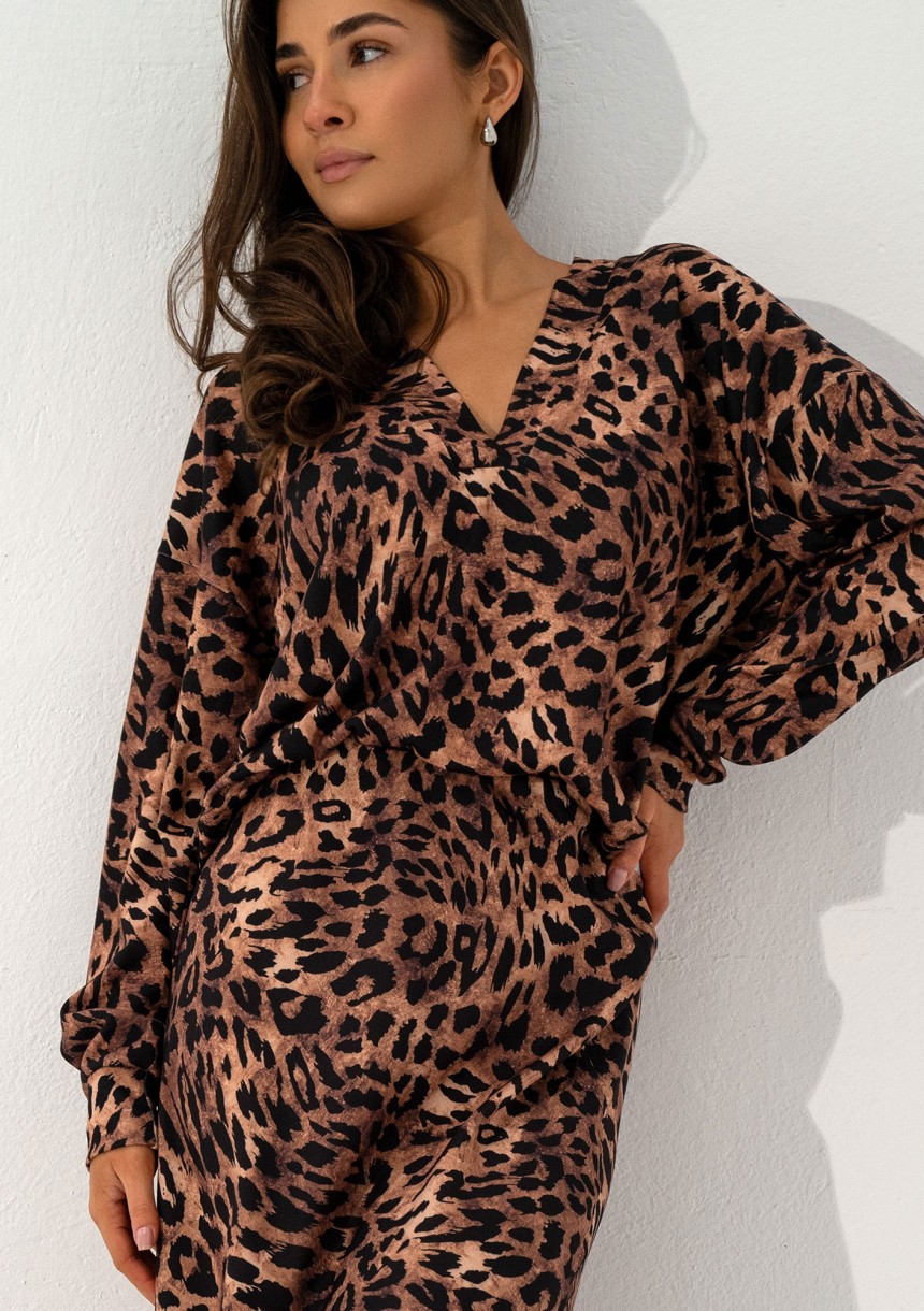 Stylowy, luźny sweter z miękkiego materiału o zwierzęcym wzorze panterki. Model z dekoltem w serek.