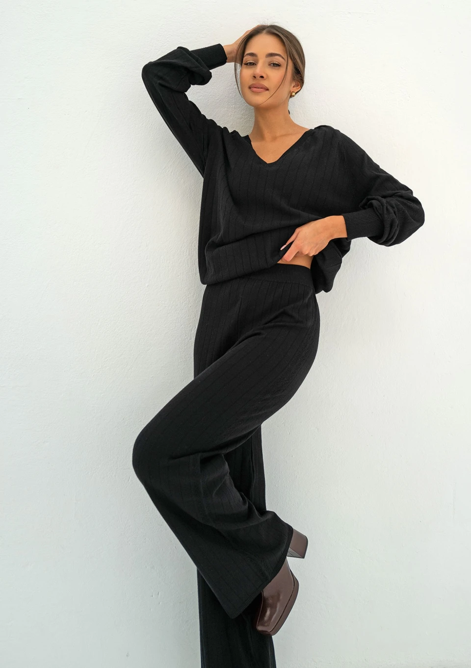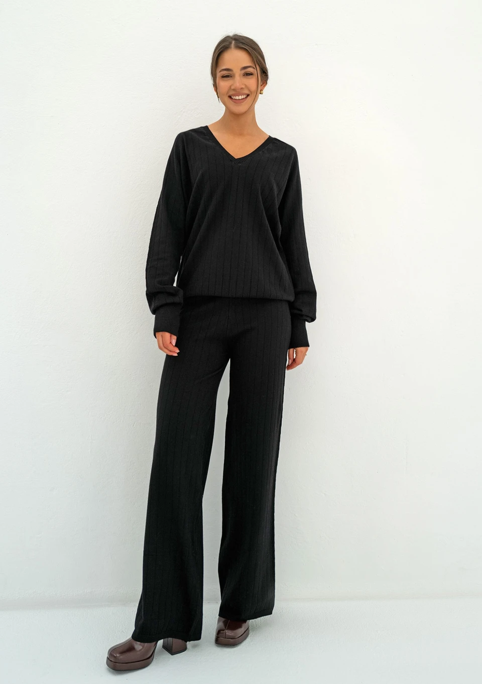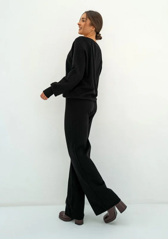 Delikatny sweter damski z miękkiej dzianiny z wiskozą. Model z dekoltem V, zdobiony drobnym ażurem. Wykonany w czarnym kolorze.
