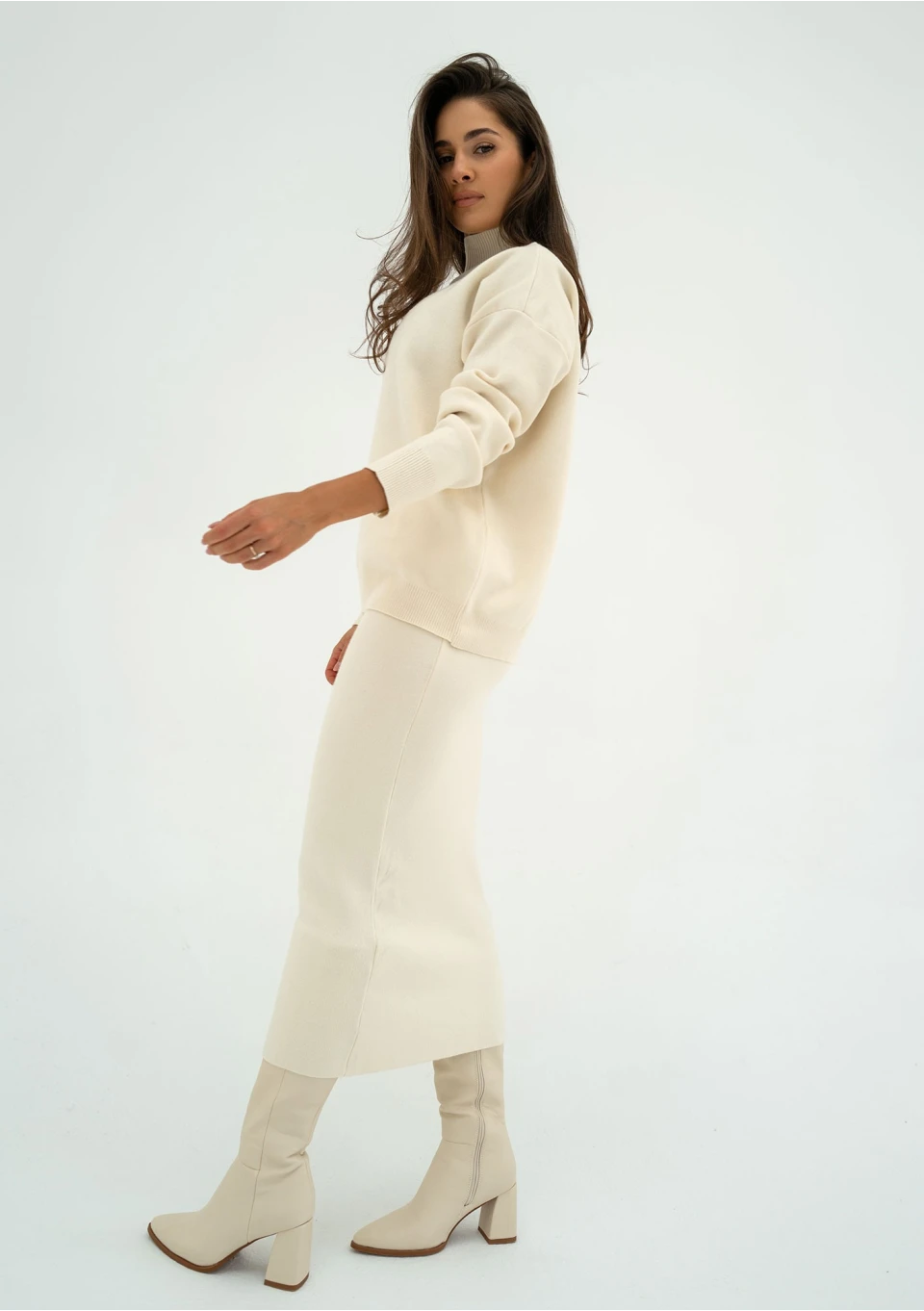 Ten kremowy sweter damski zachwyci Cię jakością materiału. Dzianina premium, zawiera przede wszystkim wiskozę. Spory udział elastanu sprawia, że włókna są wygodnie sprężyste, a poliamid nadaje im eleganckiej i miłej w dotyku gładkości. Ten fason pasuje do każdego outiftu! W jesienno-zimowej porze noś go do ulubionych dżinsów i spódniczek. Jeśli lubisz dzianinowe komplety, przygotowaliśmy do zestawu spódnicę o długości midi.