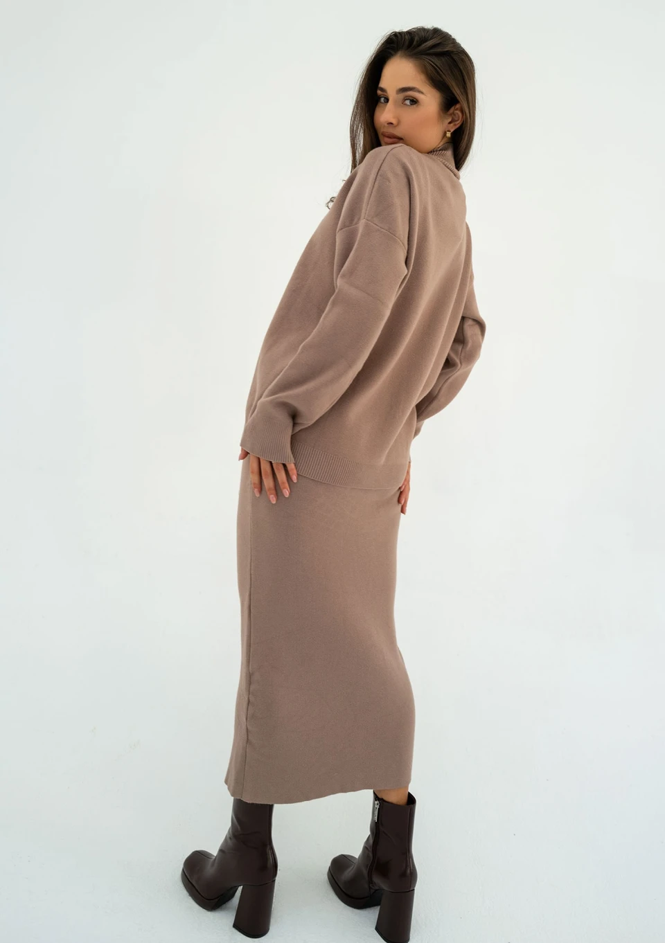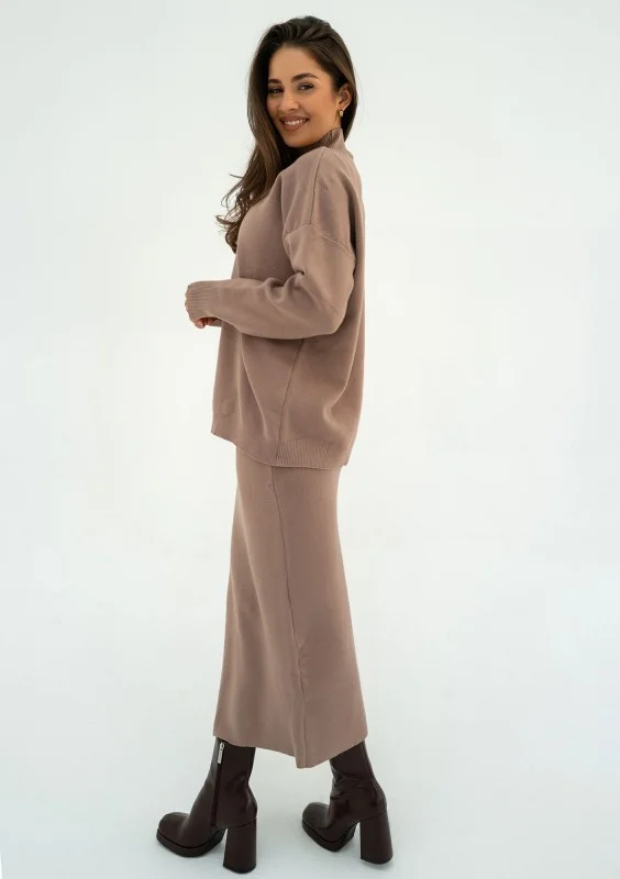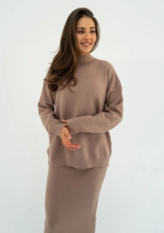 Wyjątkowo miękki i przytulny sweter o gładkiej fakturze, wykonany z dzianiny z wiskozą. Model o luźnym fasonie z drobnym golfem, w kolorze taupe.