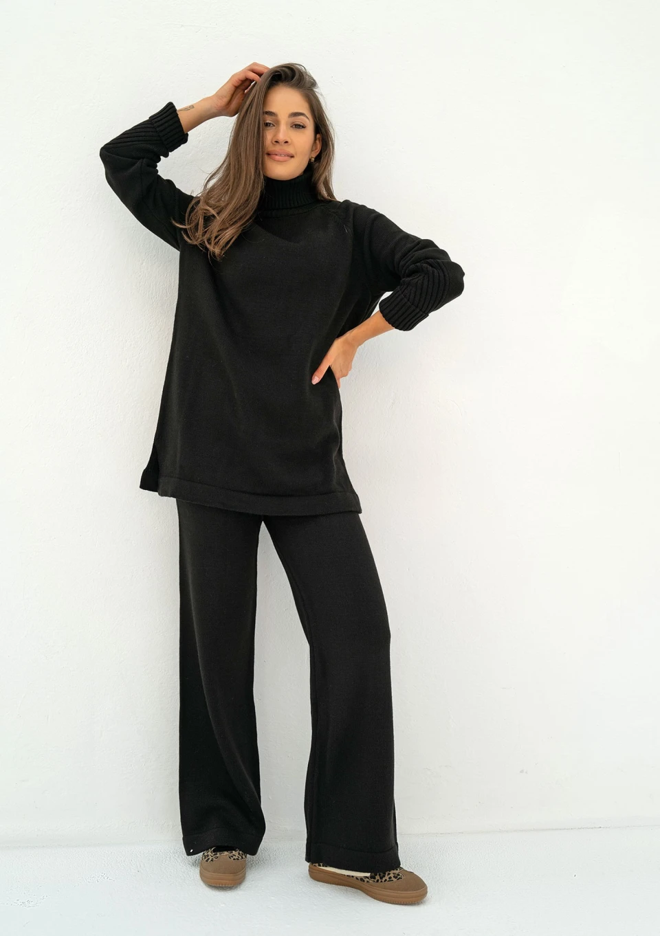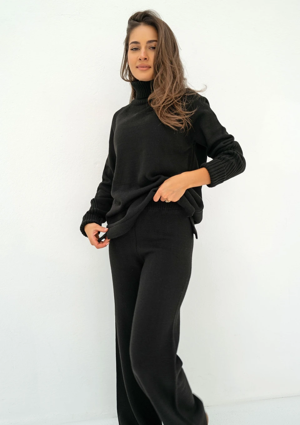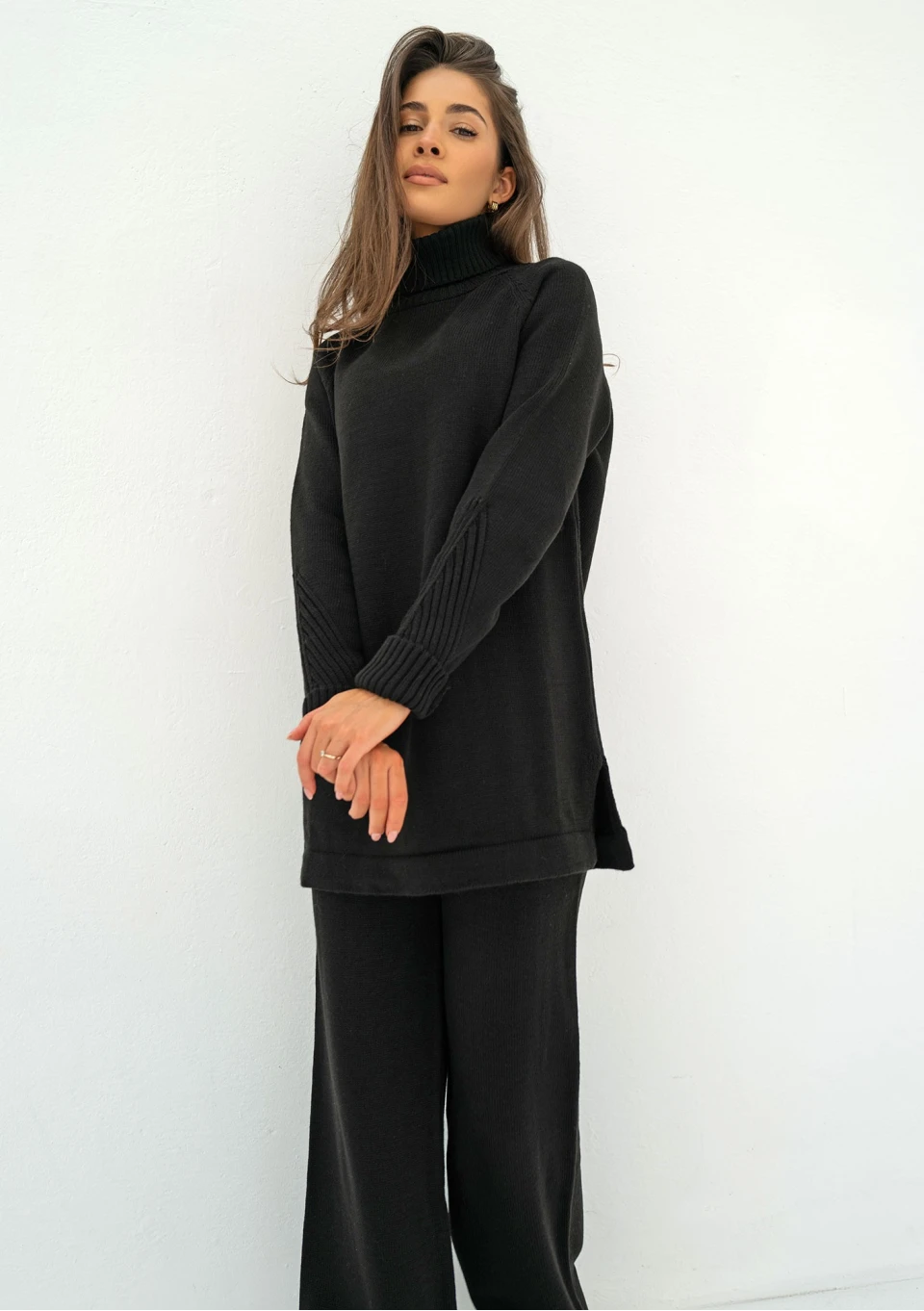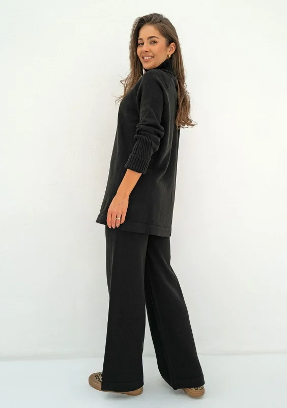Czarny sweter damski o długim kroju, z rozcięciami po bokach i wygodnym golfem. Model z pięknym urozmaiceniem, prążkowanym splotem na rękawach.