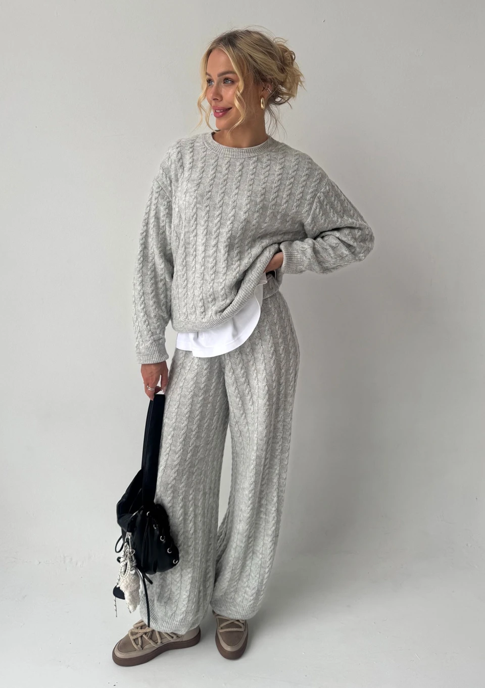 Dzianinowy sweter z przepięknym, warkoczowym splotem. Idealnie zaprezentuje się w komplecie! Model wykonany we wszechstronnym, bazowym kolorze szarym.