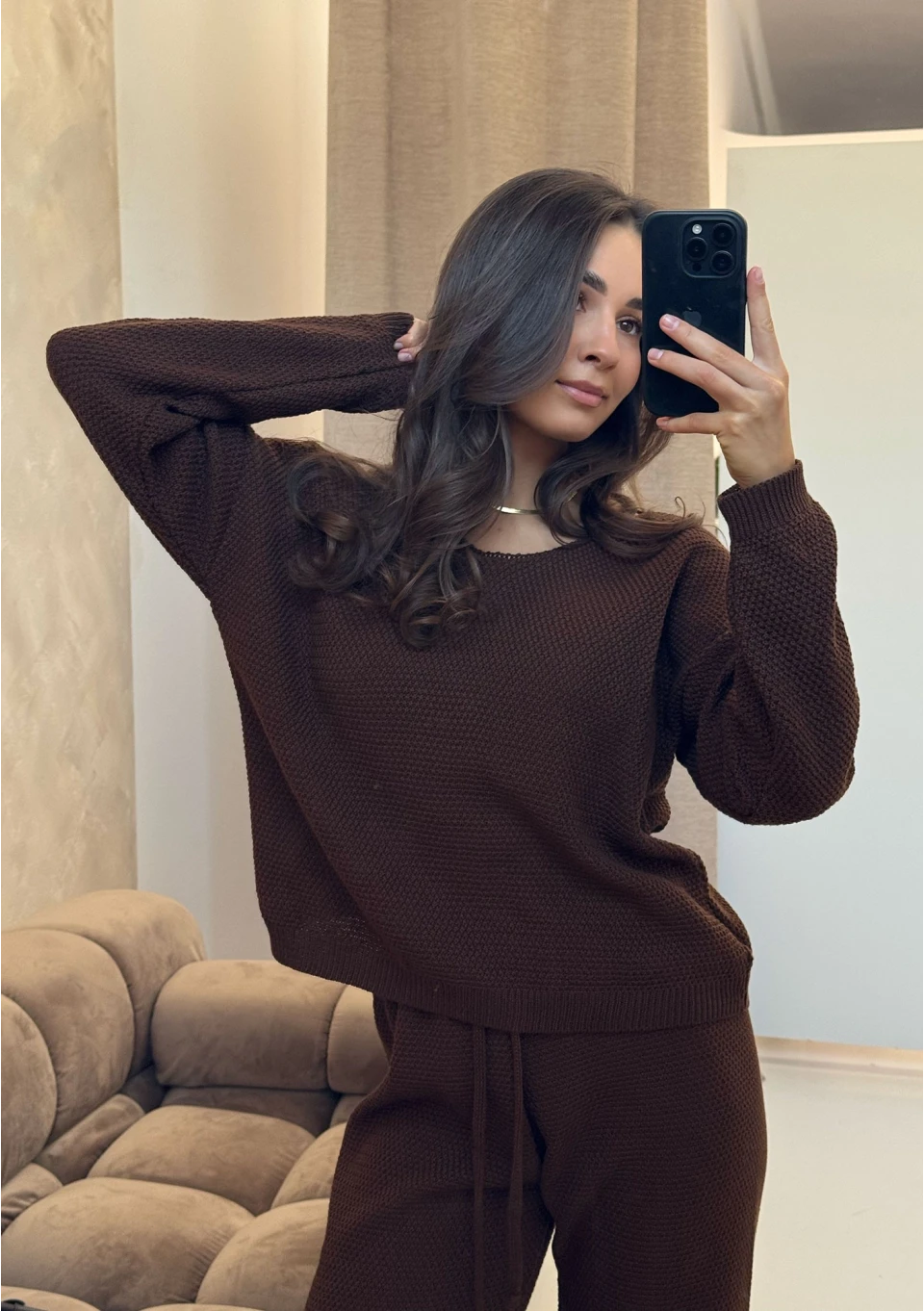 Brązowy sweter z bawełną, wykonany z miękkiej dzianiny o waflowym splocie. Dekolt o delikatnym wykroju łódki.