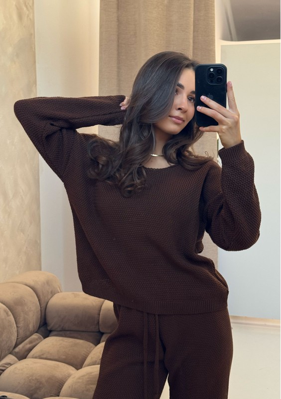 Brązowy sweter z bawełną, wykonany z miękkiej dzianiny o waflowym splocie. Dekolt o delikatnym wykroju łódki.