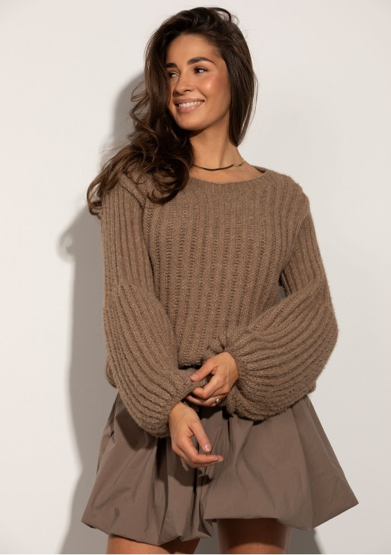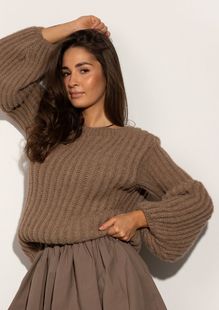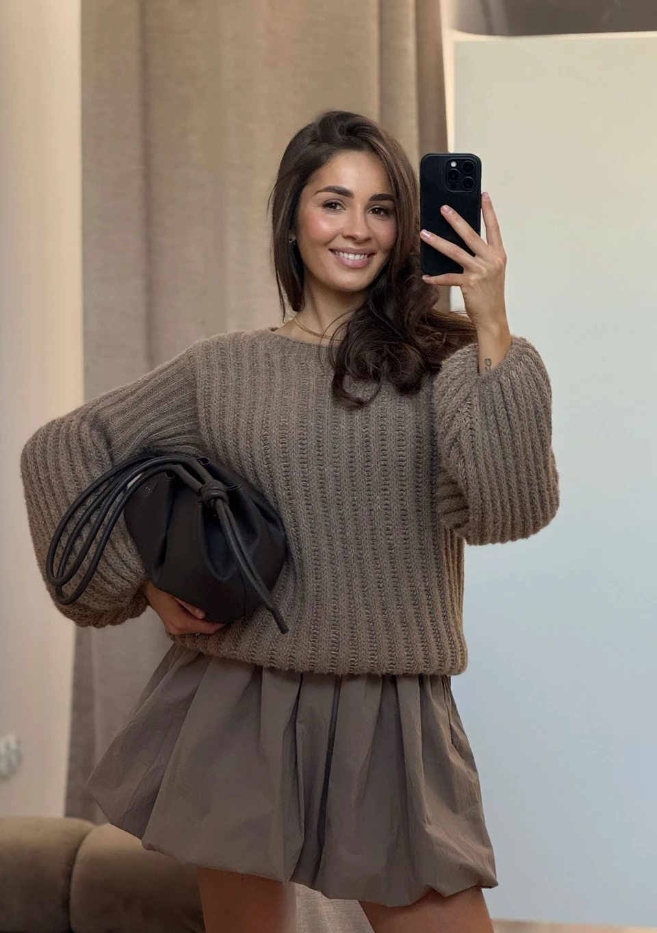 Odwzoruj naszą piękną stylizację! Ten surowo splatany w grube pręgi sweter stylowo przełamie subtelną spódniczkę mini o kroju bombki ,,Floe". Całość prezentuje się lekko, dziewczęco i przytulnie! Taki look dopełnij masywnymi botkami lub kozakami na szpilce, w zależności jak definiują Twój styl.