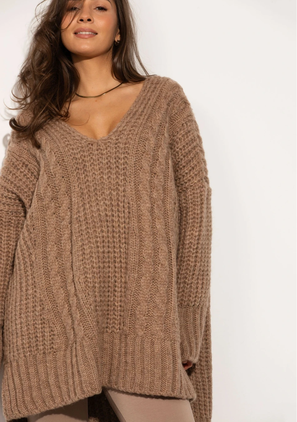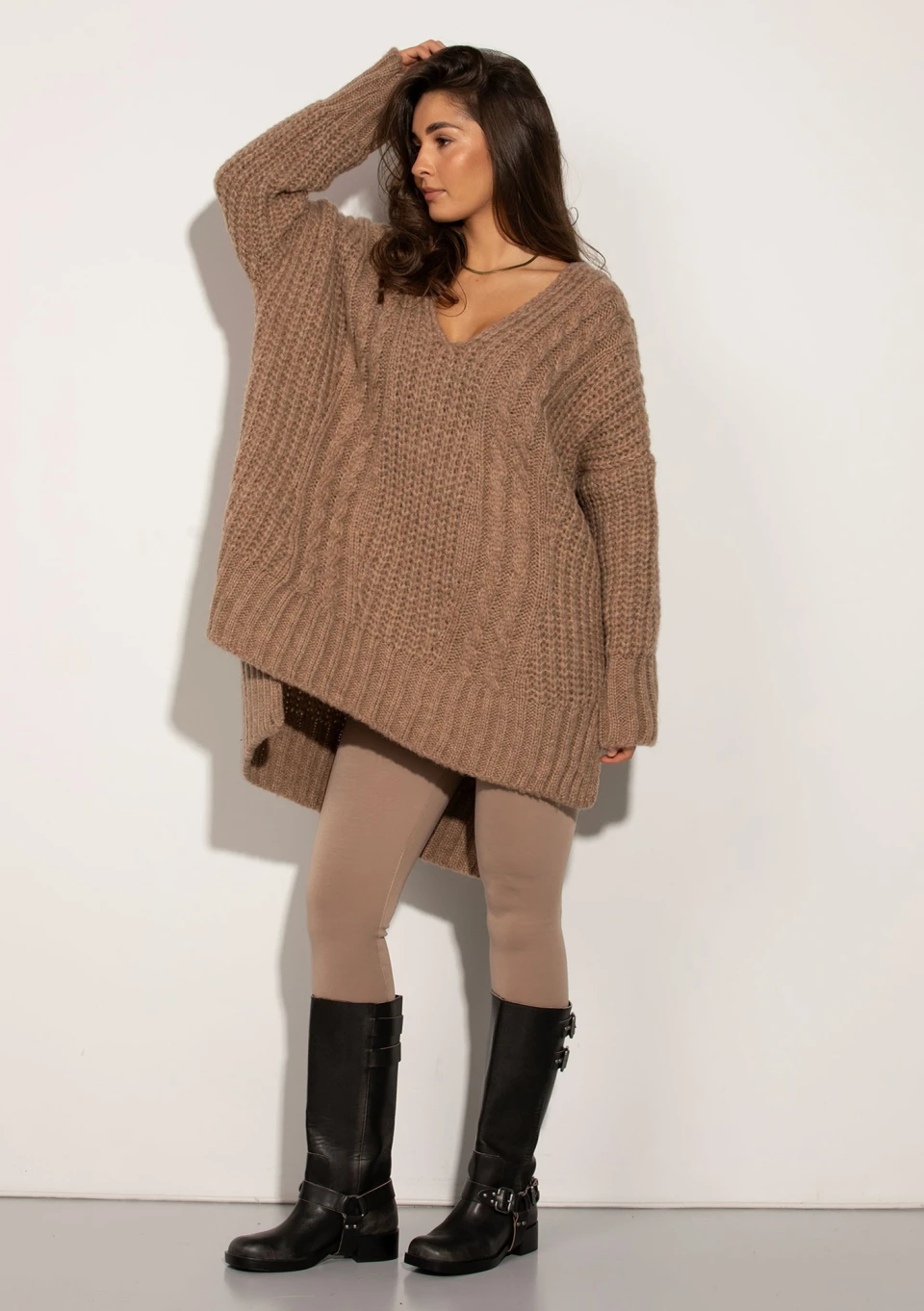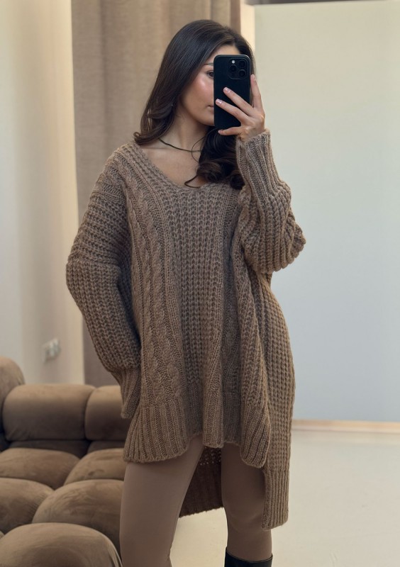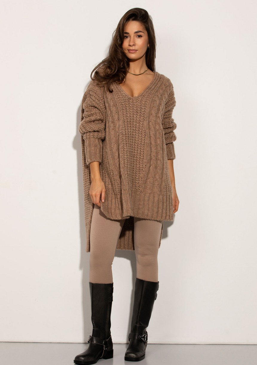 Model Lofty Long to długi sweter o modnej formie oversize, wyróżniający się asymetryczną długością. Jest krótszy z przodu i z boku ma wyraźne rozcięcia, które gwarantują swobodny, niekrępujący fason. To sweter damski z dekoltem V, pięknie zdobiony warkoczowym splotem. Możesz nosić go jako ciepłą tunikę do legginsów czy ulubionej pary jeansów oraz stylizować paskami, by nadać lekkiej, kobiecej formy. Model został wykonany z miękkiej dzianiny w jasnym, beżowym odcieniu zbliżonym do kawy z mlekiem.