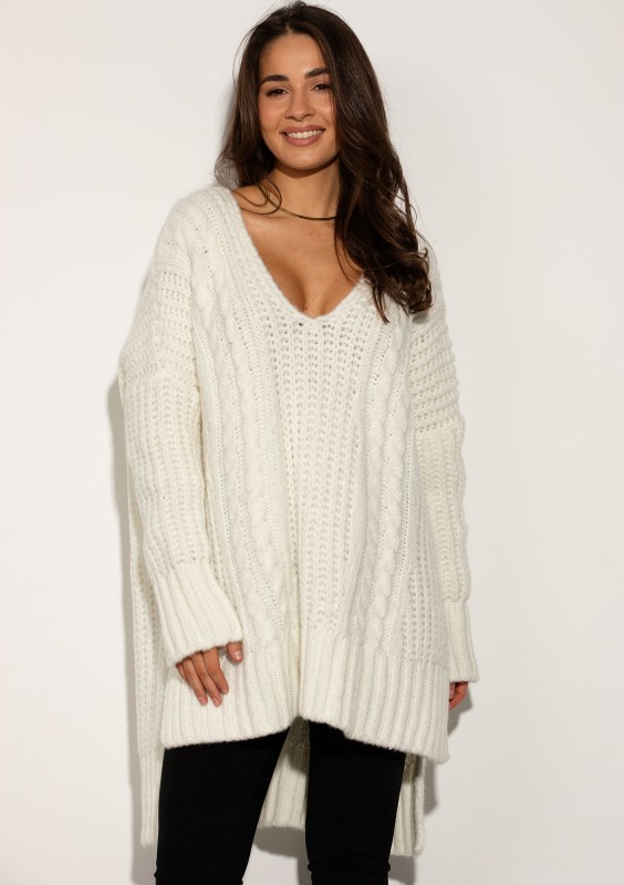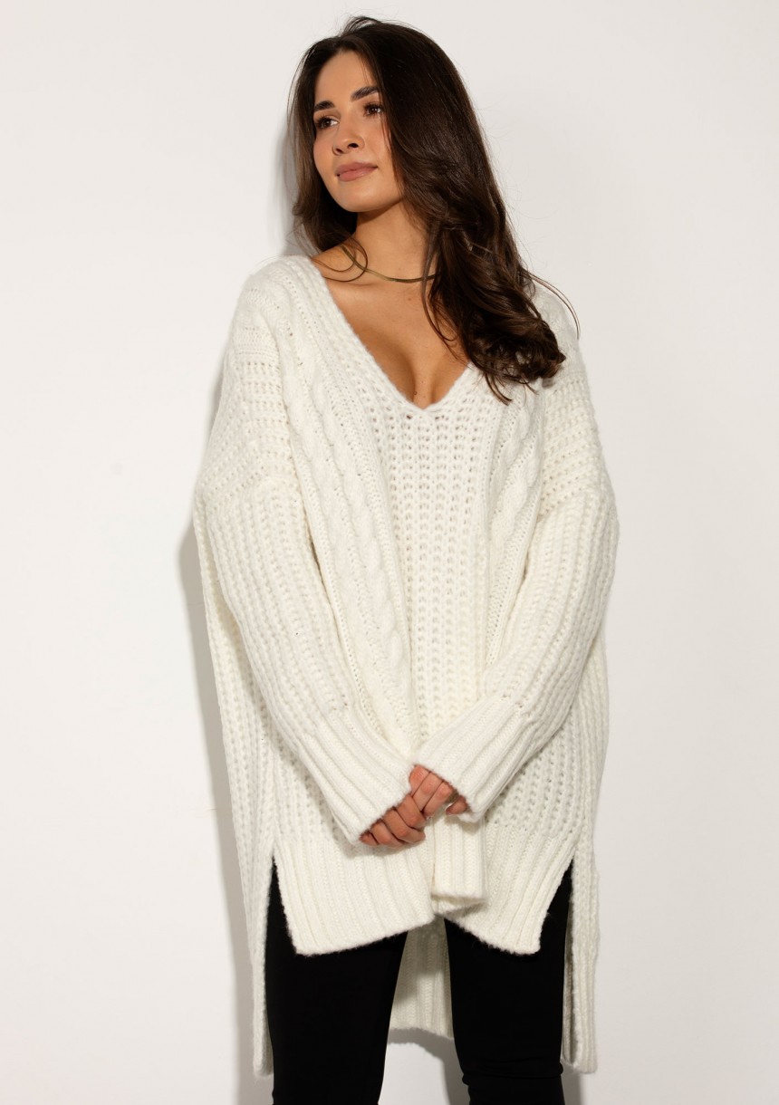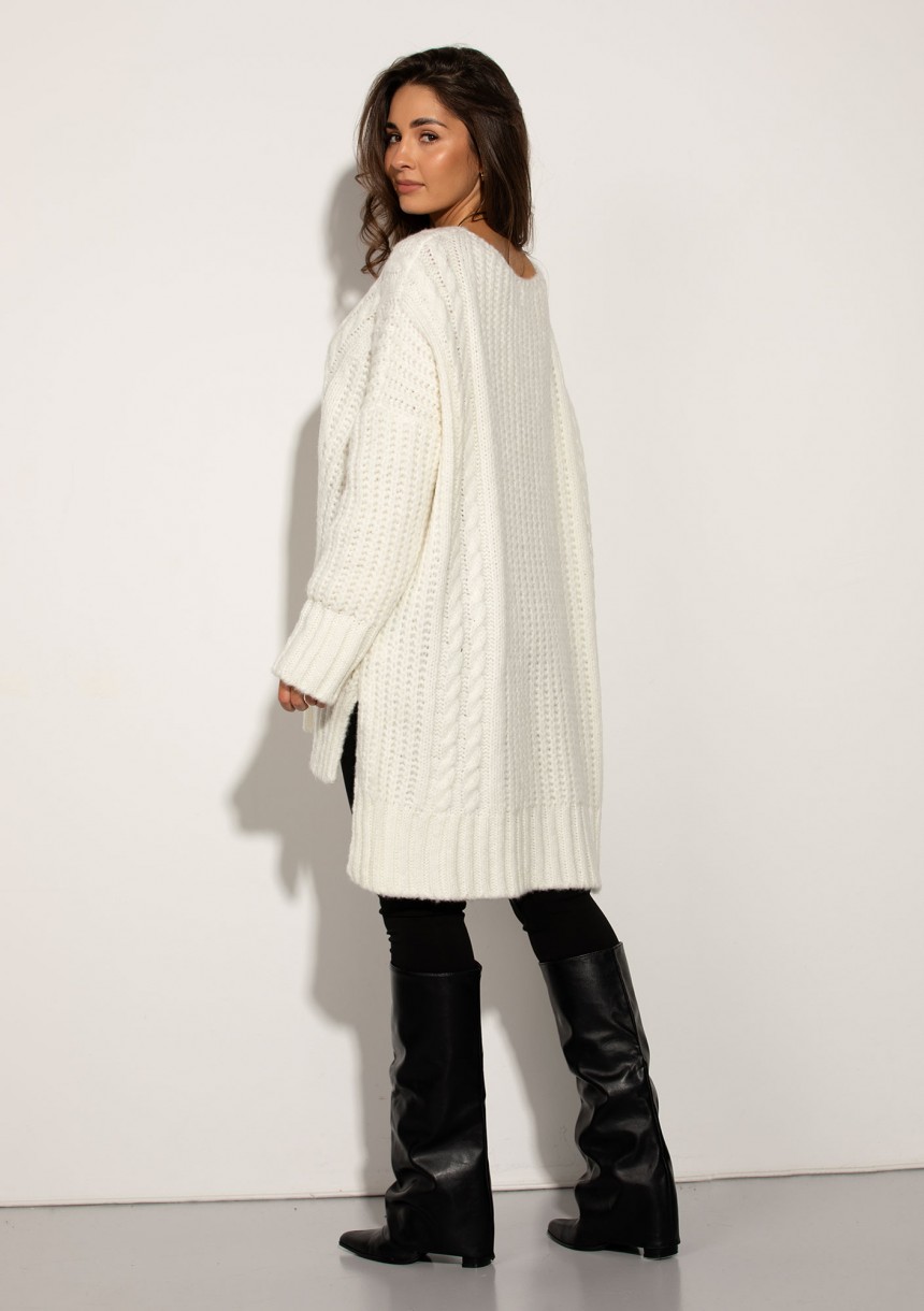 Lofty Long – Długi sweter oversize o grubym splocie z warkoczem Ecru