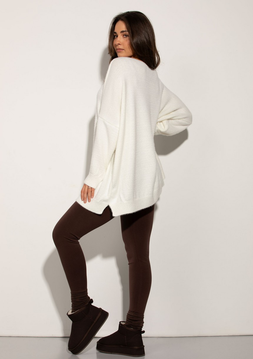 Miękki sweter damski w kolorze ecru, wykonany z dzianiny z drobnym włosiem. Model o swobodnym, nieco dłuższym kroju oversize.