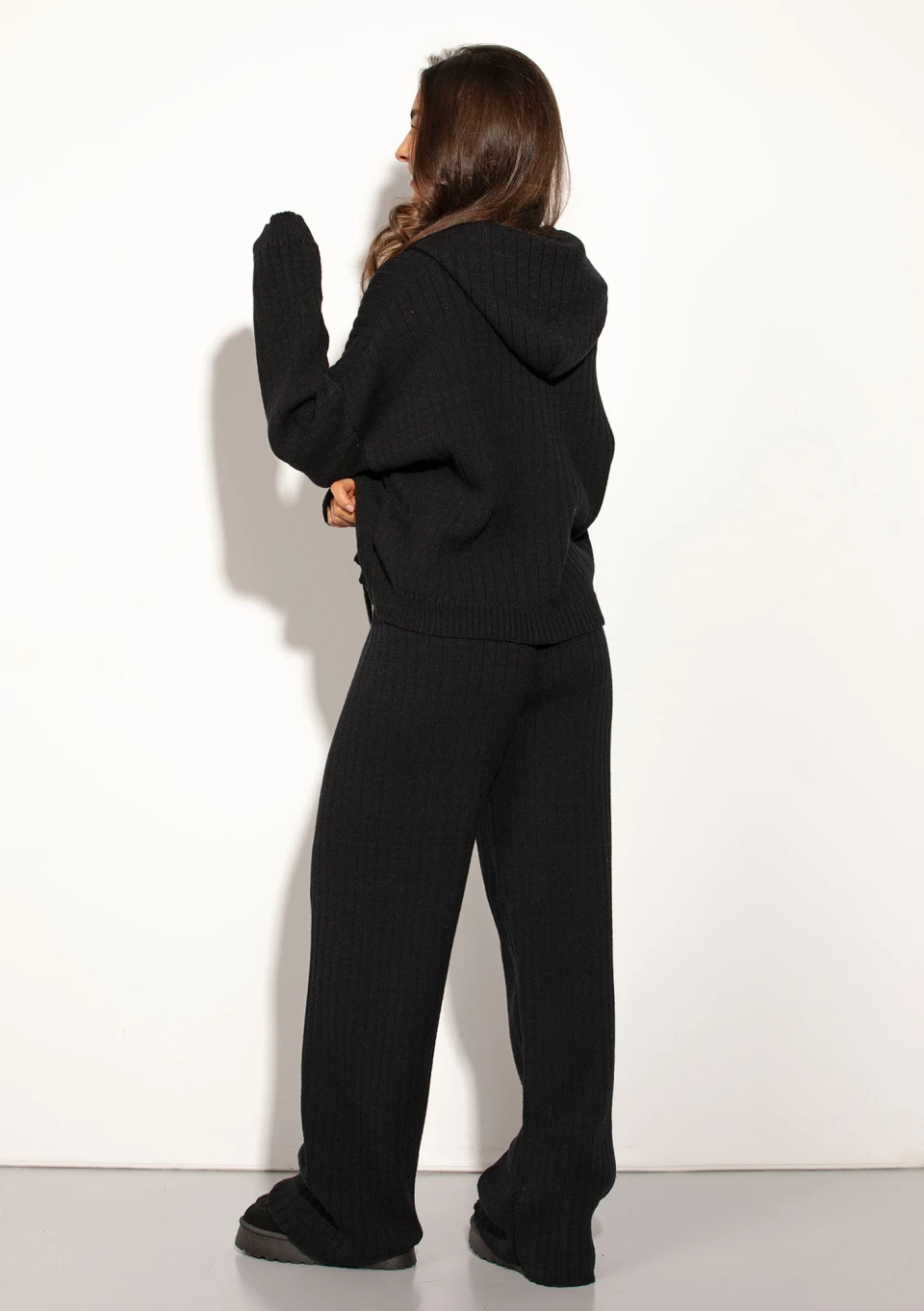 Wygodna i bardzo uniwersalna, czarna bluza dzianinowa z kapturem i troczkami. Posiada fakturę w prążki.