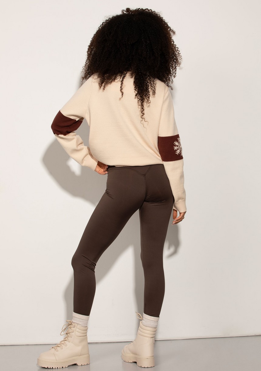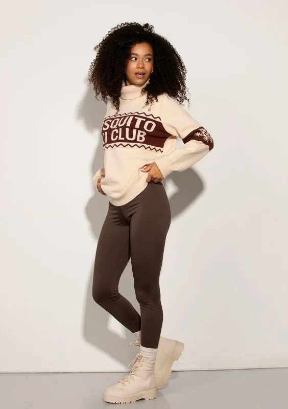 Wyjątkowy sweter damski z zimowej kolekcji za każdym razem przypomni o urokach zimy! Dedykowany miłośniczkom narciarstwa, ale też idealny dla każdego, kto pragnie otulić się ciepłą dzianiną i wprawić się w dobry, błogi nastrój. Sweter ma jasny, ciepły odcień ecru z brązowym nadrukiem. Miękka dzianina składająca się w dużej mierze z wiskozy charakteryzuje się optymalnie grzejącą strukturą i gładką, estetyczną fakturą.