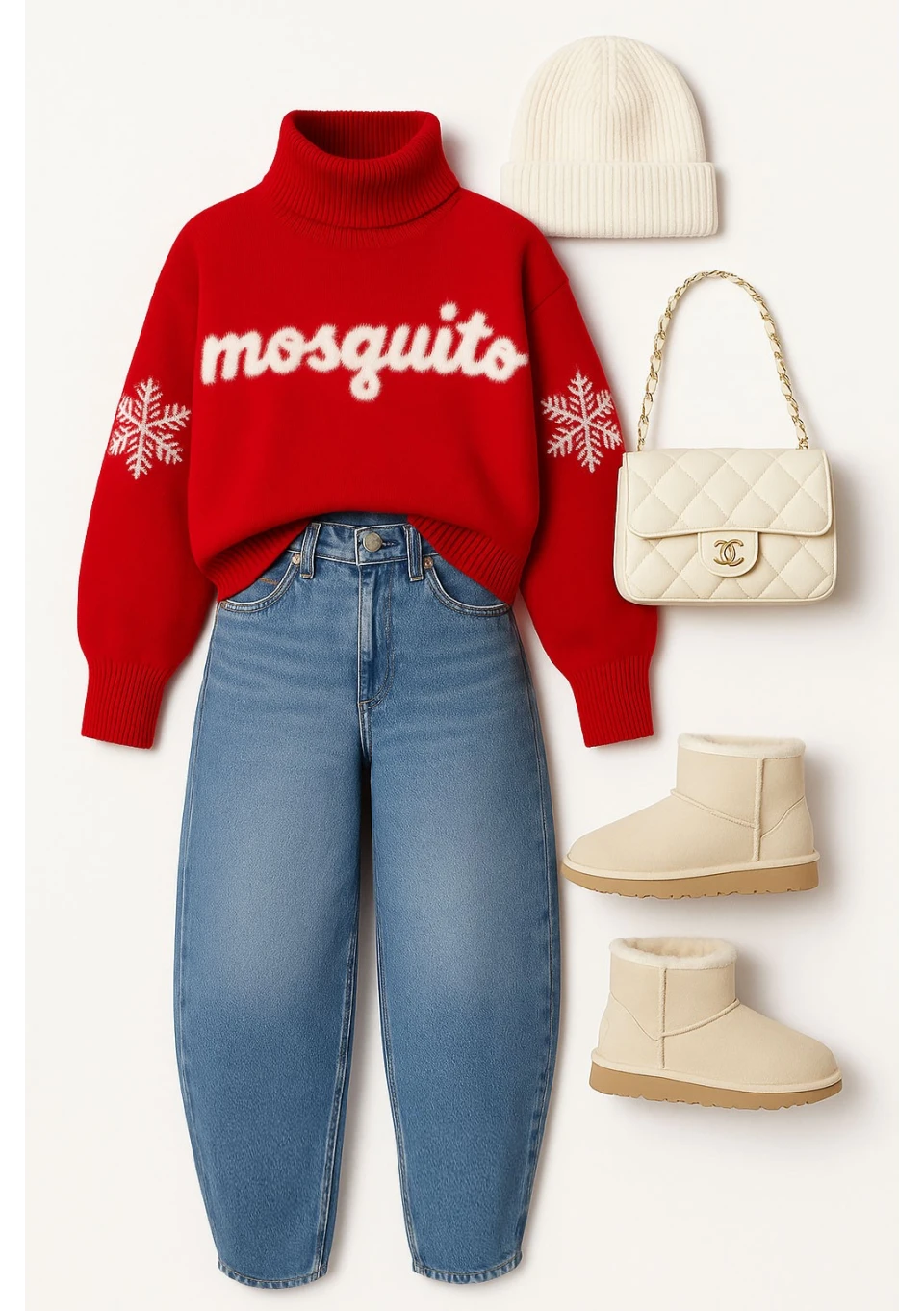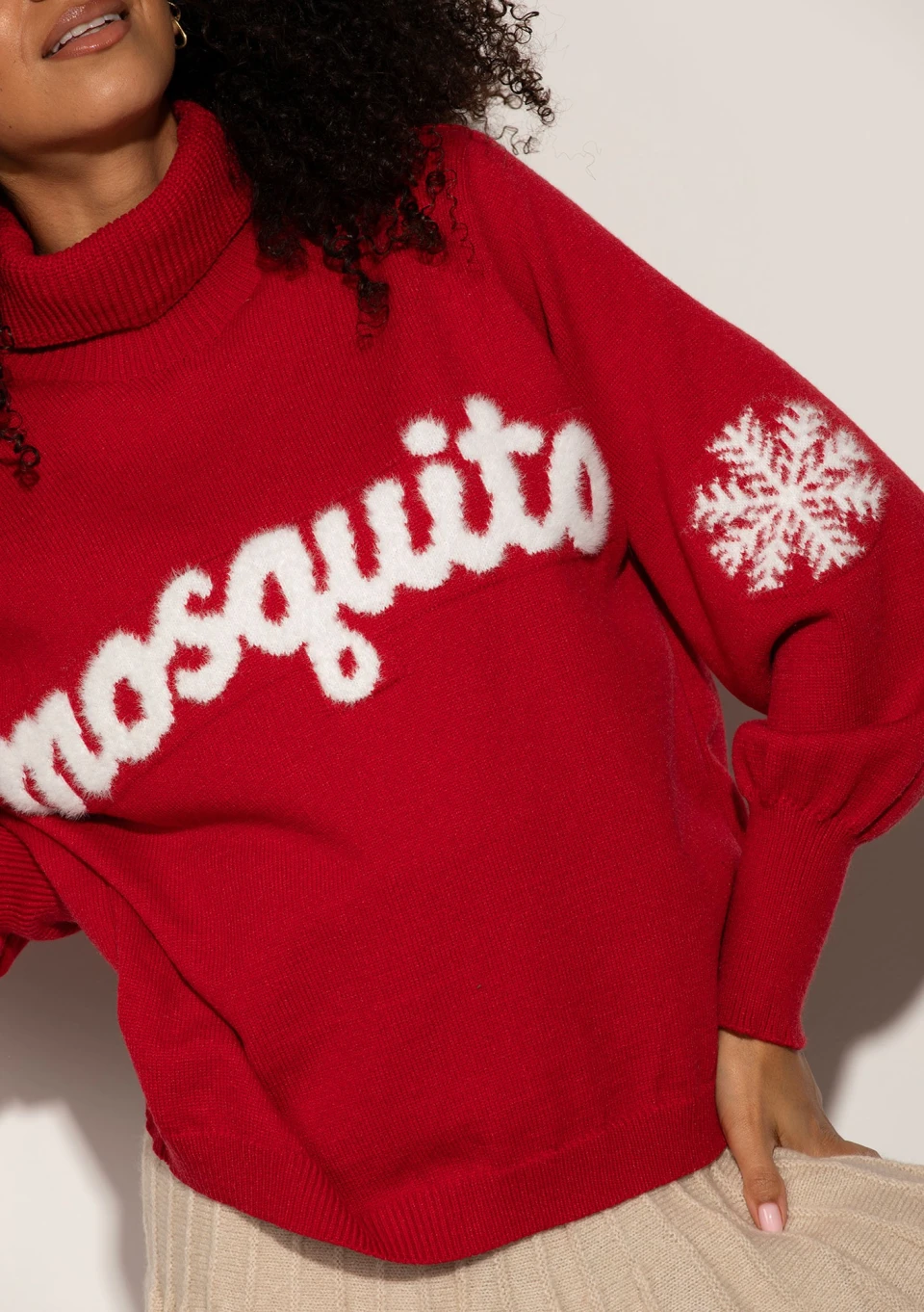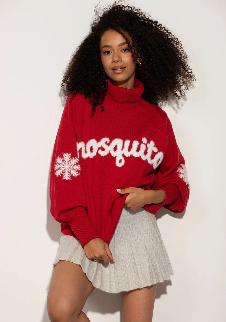 Czerwony sweter z golfem, zdobiony puchatym logotypem i motywem śnieżynek będzie idealnym dopełnieniem świątecznych i zimowych stylizacji.