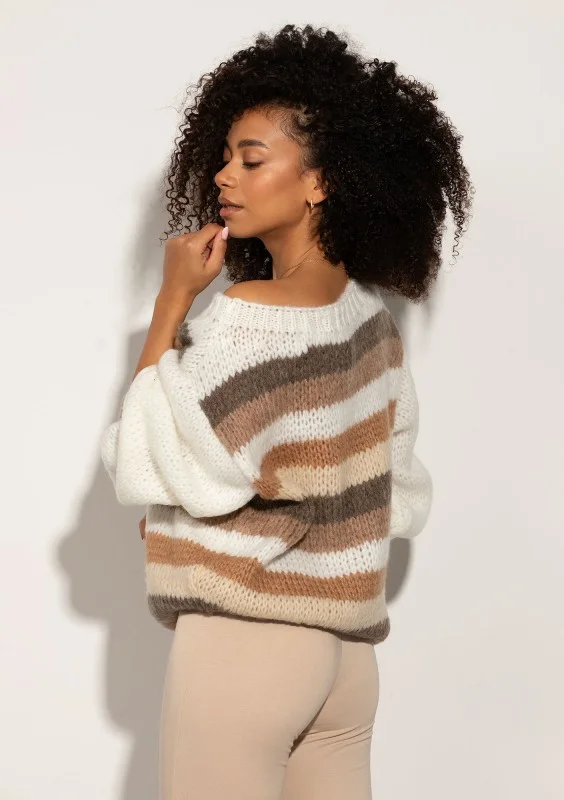 Sweter o luźnym kroju z delikatnym dekoltem w łódkę. Wykonany z miękkiej dzianiny z wełną, o rzadkim splocie. Zdobiony wzorem w kolorowe pasy.