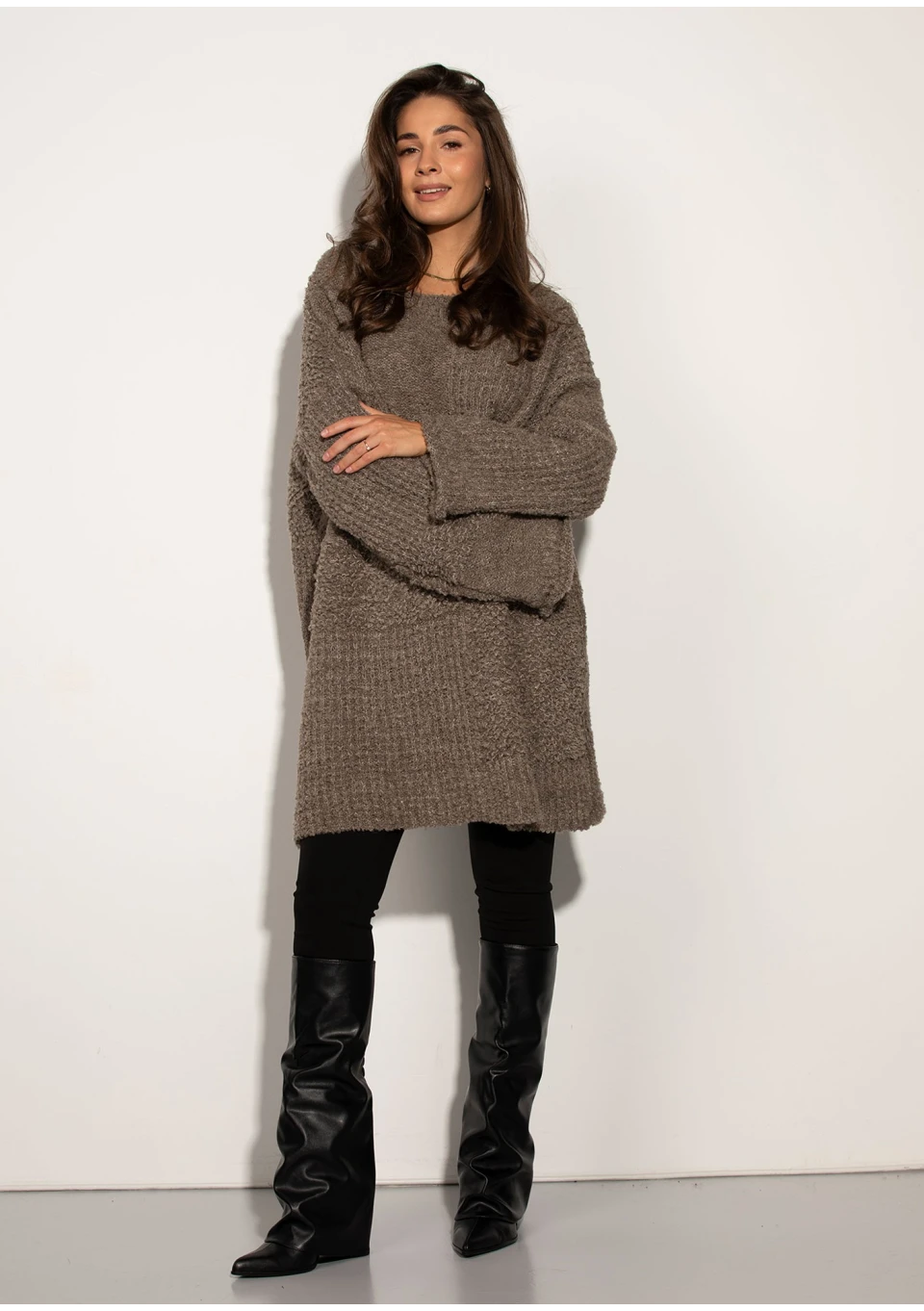 Modny sweter oversize w łatwym do stylizowania kolorze taupe. Dzianin buklowa ma miękką, urozmaiconą pętelkami fakturę.