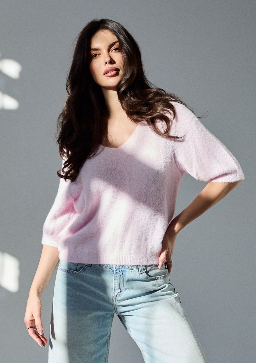 Mimi Soft to wyjątkowo lekki sweter. W delikatnej formie z dekoltem V i skróconym rękawem doda subtelności! Miękki i przyjemnie puszysty, w różowym kolorze.