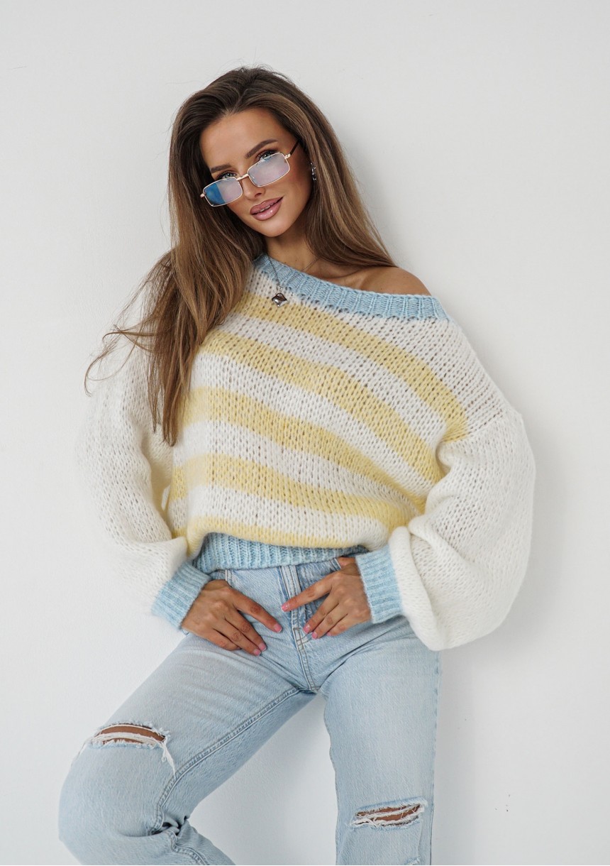 Sweter damski z wełną, w żółte i błękitne pasy. Czy można przejść obok niego obojętnie? Ten pasiasty sweter doda Twoim stylizacjom odrobinę magii i rozświetli każdy dzień.