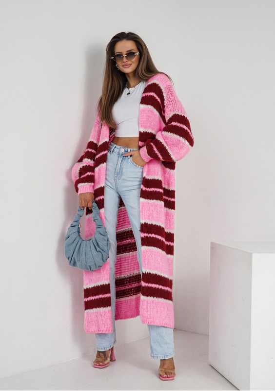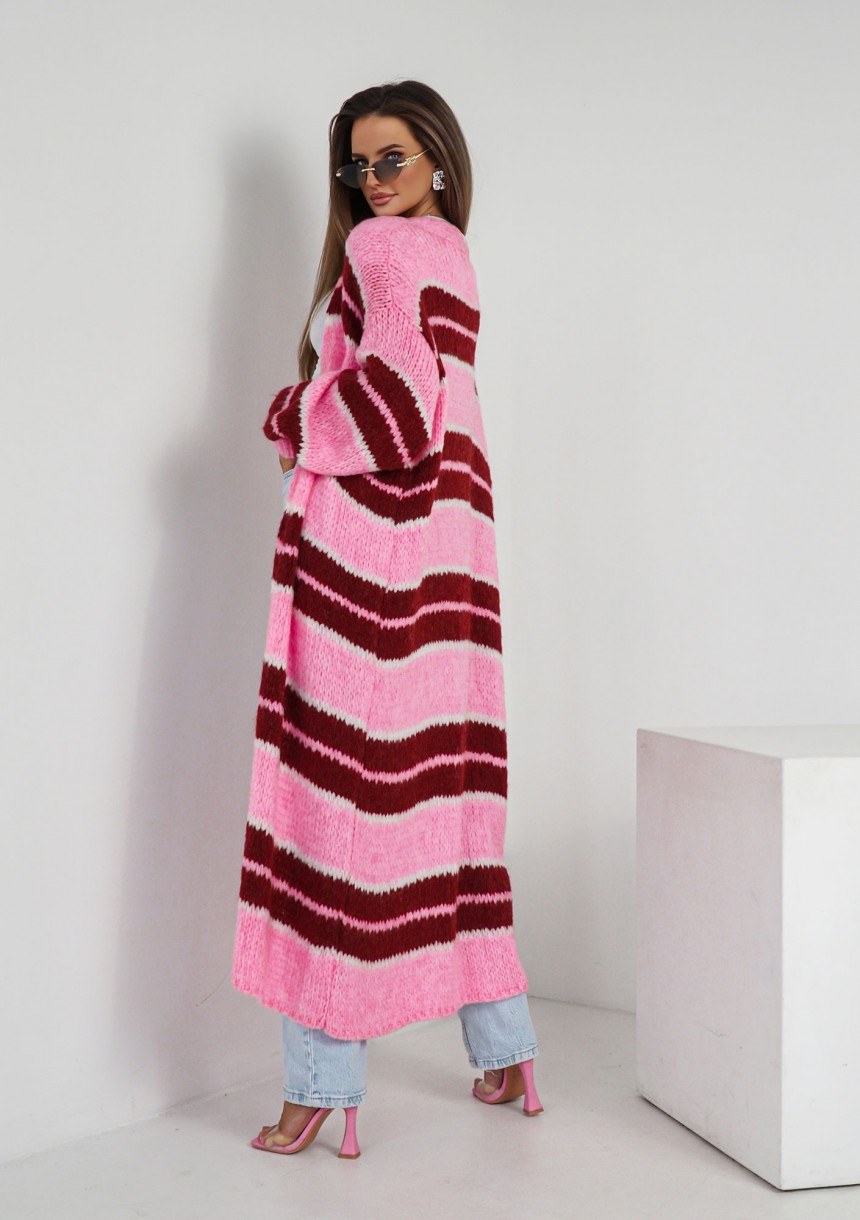 Długi kardigan w pasy, w słodkich kolorach różu, czerwieni i ecru. Niezwykle wszechstronny, dopasowuje się do rytmu Twojego dnia i zmieniających się potrzeb.