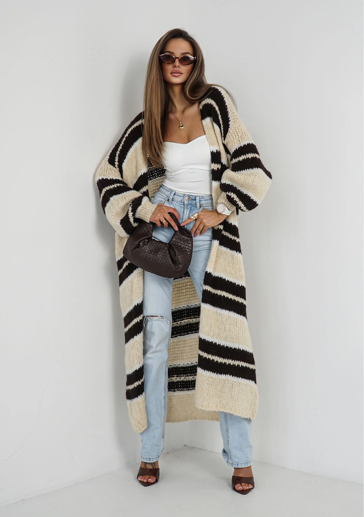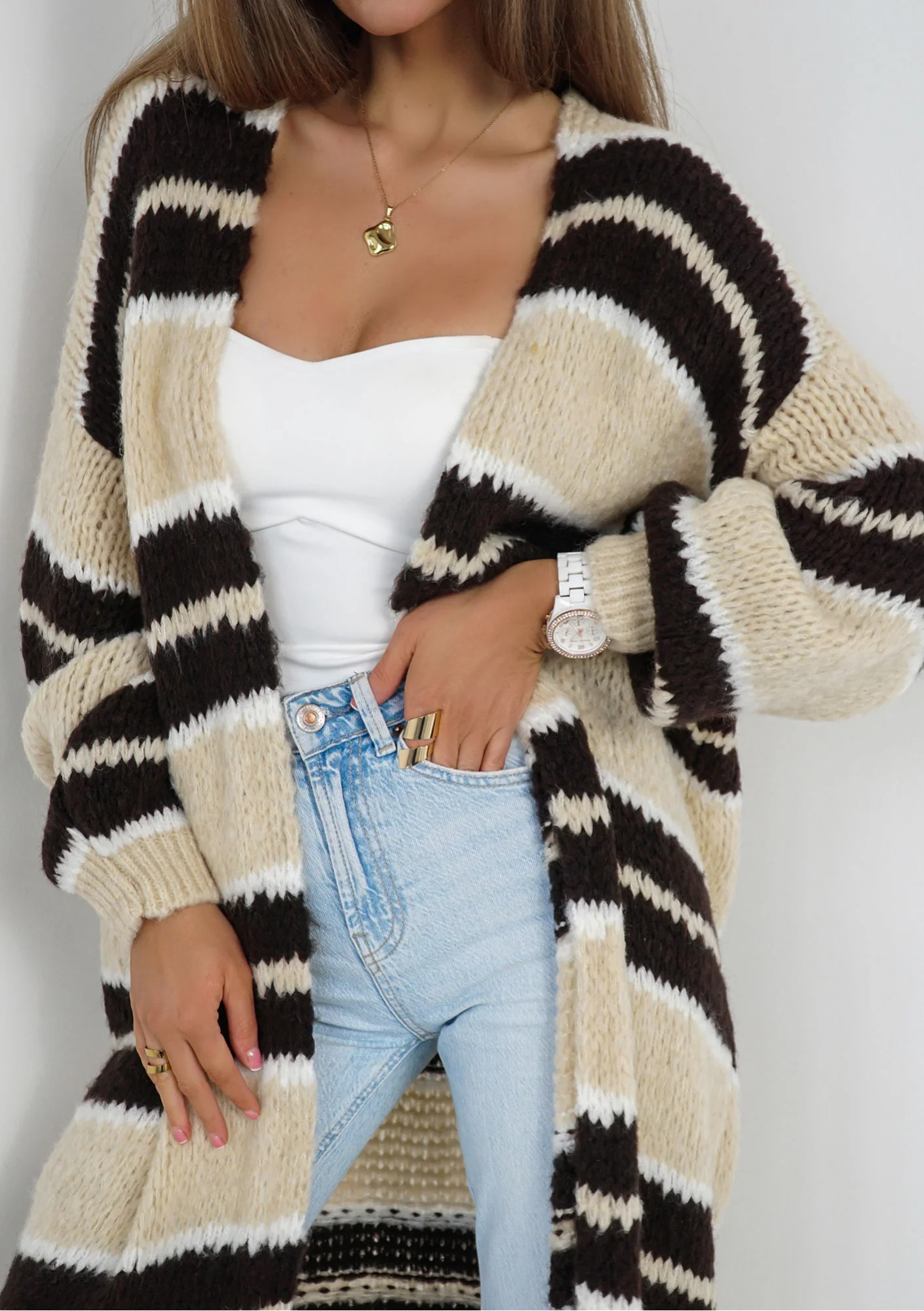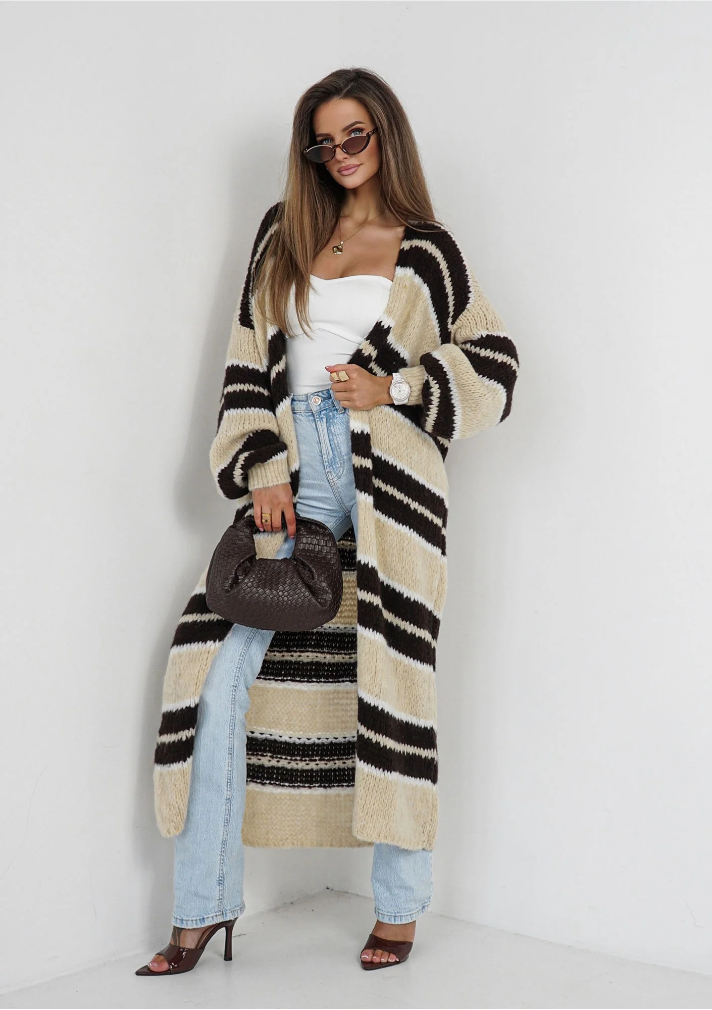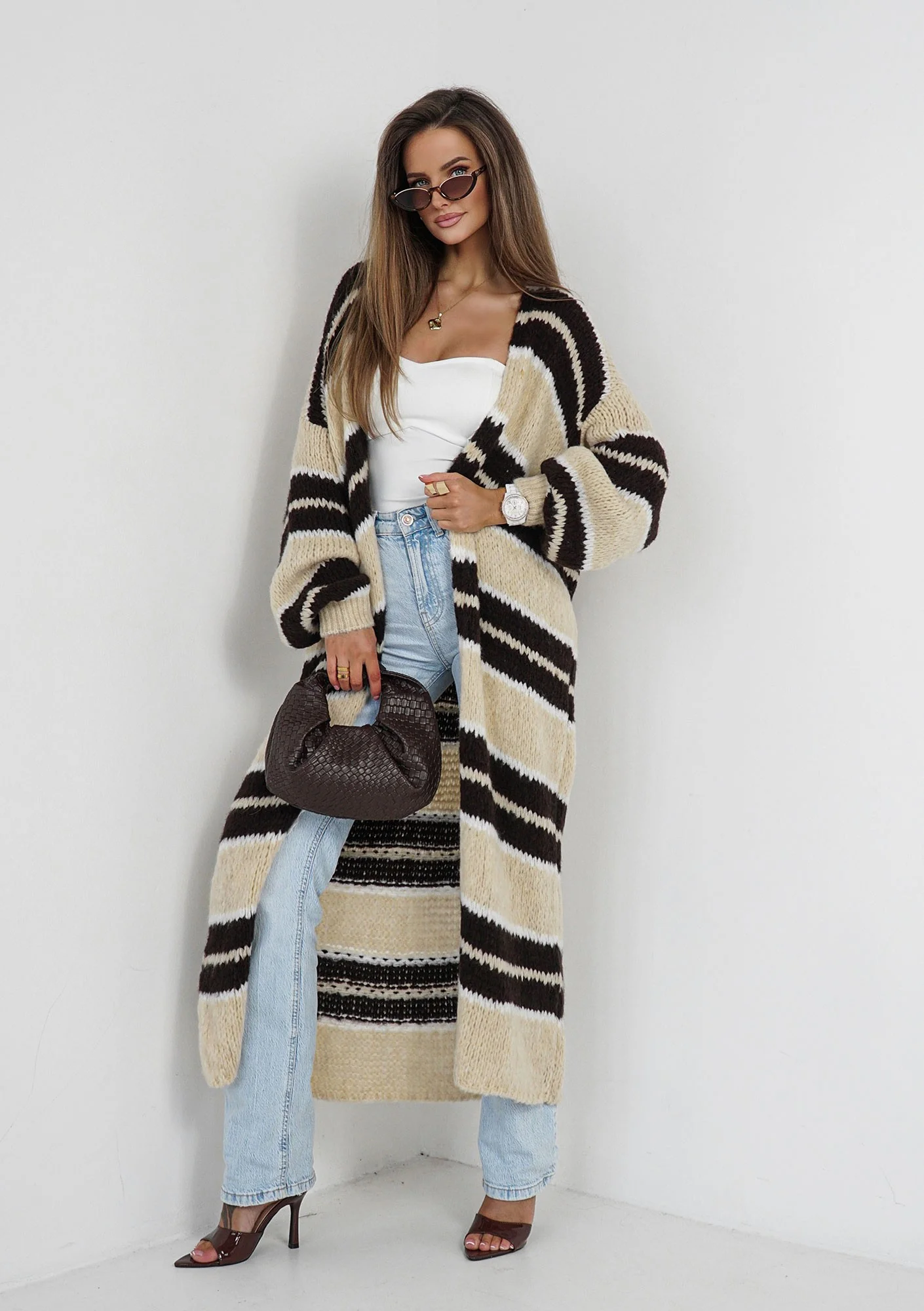 Marin - Dzianinowy kardigan maxi w pasy Beżowy