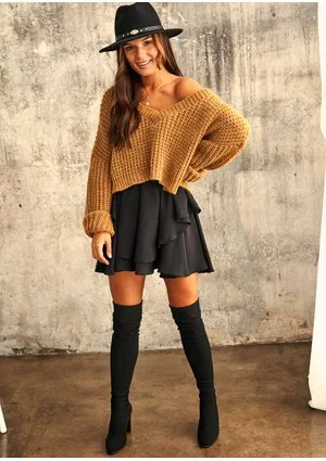 Krótkie swetry damskie są modne już od kilku sezonów. Mosquito nie pozostało obojętne na bieżące trendy i w swoich kolekcjach uwzględnia ten seksowny fason. Zmysłowy, miodowy sweter z moherem ma dekolt w kształcie V i zwraca uwagę grubym ściegiem. Krótka forma została zrównoważona długimi rękawami, które można dogodnie podwinąć. Dopracowane wykończenia u dołu i przy dekolcie dodają mu atrakcyjności. Sam dekolt w kształcie litery V stwarza możliwość do podkreślenia outfitu ciekawym naszyjnikiem. Luźny miodowy sweter z moherem zalotnie odkrywa ramiona, co sprawia, że nadaje się głównie na cieplejsze dni. Sięgając tylko do pasa, świetnie prezentuje się ze spodniami i spódnicami z wysokim stanem. Można go łączyć z odzieżą zarówno o jasnych, jak i ciemnych barwach. W casualowych zestawieniach nie musisz ograniczać swojej wyobraźni! Sweter doskonale komponuje się m.in. z rozkloszowaną spódniczką również dostępną w ofercie Mosquito. Szykowne swetry damskie Mosquito są szyte w Polsce, a ich projekty wychodzą spod ręki Alicji Komar, która zawsze stawia na maksymalny komfort i atrakcyjny design tworzonych ubrań. Nic dziwnego, że kolekcje Mosquito są cenione przez Polki znane z pierwszych stron gazet!