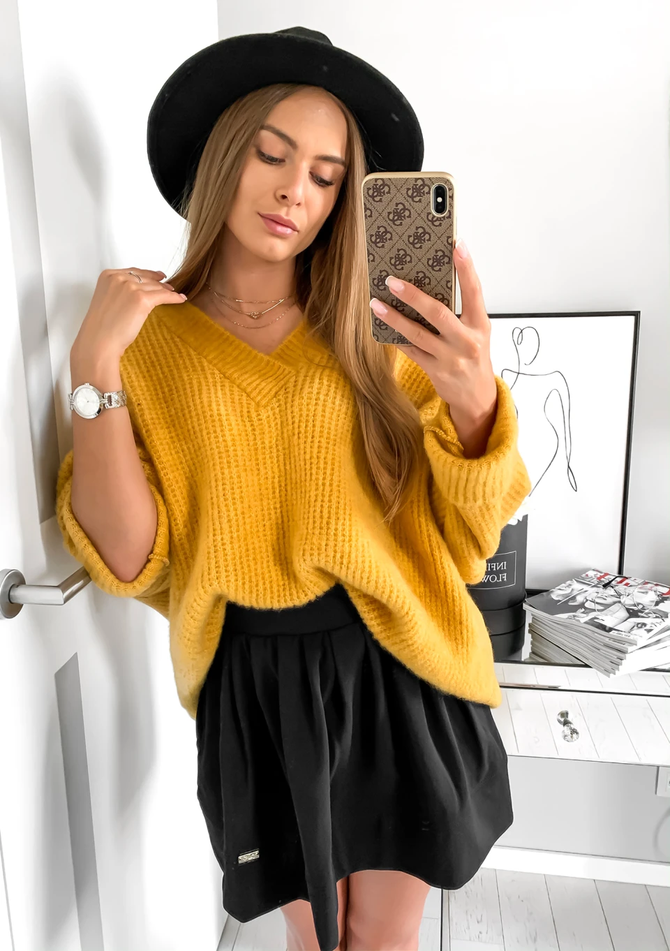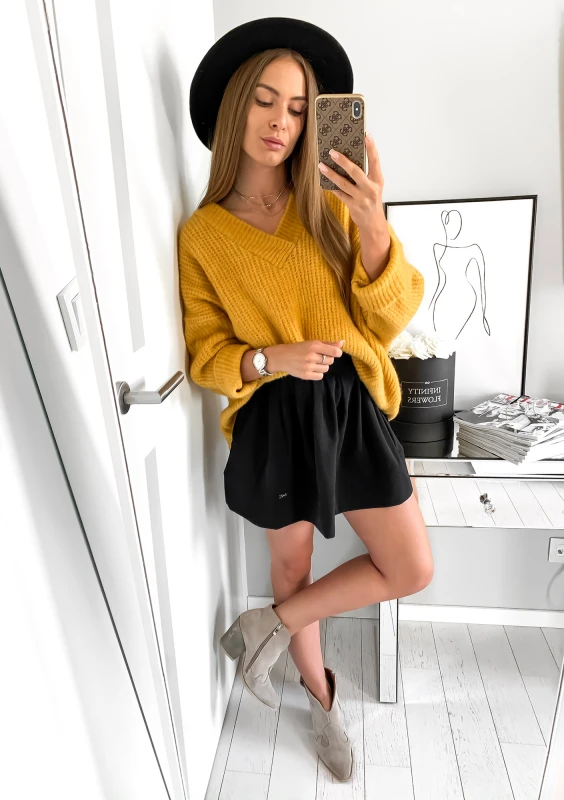 Musztardowy sweter z dekoltem w serek z ciepłej i miękkiej dzianiny z wełną. To uniwersalny model, którym okryjesz sylwetkę w stylowy sposób. Sweter jest bardzo luźny, to klasyczny fason oversize.