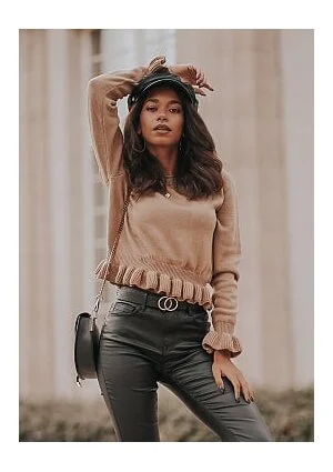 W kolekcjach Mosquito regularnie pojawiają się swetry damskie, które wyróżnia nie tylko oryginalny design, ale też wygoda noszenia i nieprzeciętna trwałość. Główna projektantka marki - Alicja Komar stawia również na modne kolory, zgodne z aktualnymi trendami. Czarujący, beżowy sweter z falbanką jest połączeniem tych zalet! Krótki sweter idealnie pasuje do spodni z wysokim stanem. Można skompletować go z jeansami, spodniami skórzanymi i niektórymi modelami dzianinowymi. Został wykonany z precyzyjnie wyselekcjonowanego materiału o nieprzeciętnych właściwościach. Wysokogatunkowy akryl nie tylko doskonale układa się na ciele, ale jest też odporny na odkształcenia i nie gniecie się. Prosty w pielęgnacji, jest również bezpieczny dla skóry. Miękka, włoska przędza sprawia, że sweter jest tak delikatny i miły w dotyku. Jego noszenie to prawdziwa przyjemność! Neutralny odcień beżu sprawia, że sweter z falbanką pasuje zarówno do jasnych, jak i ciemnych spodni. Daje też dużą dowolność w doborze barwy dodatków. Wyraźna falbanka u dołu swetra oraz przy rękawach nadaje mu bardziej dziewczęcego looku. To propozycja dla kobiet, które doskonale czują się we własnej skórze i uwielbiają podkreślać swoją kobiecość!