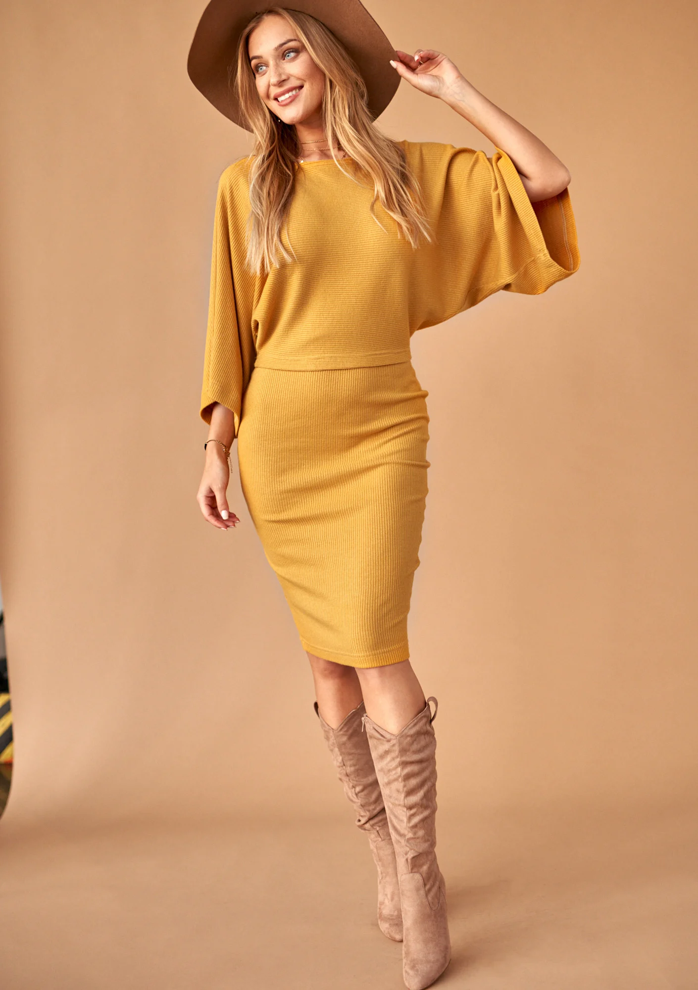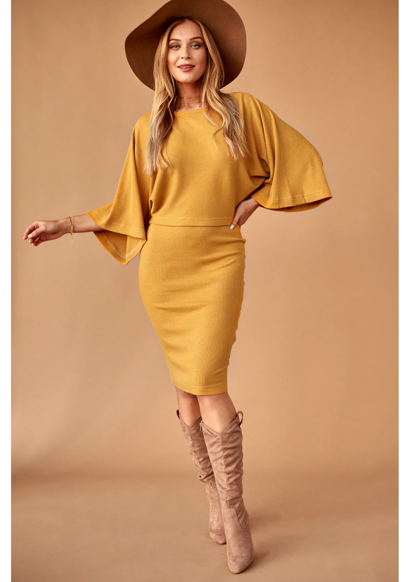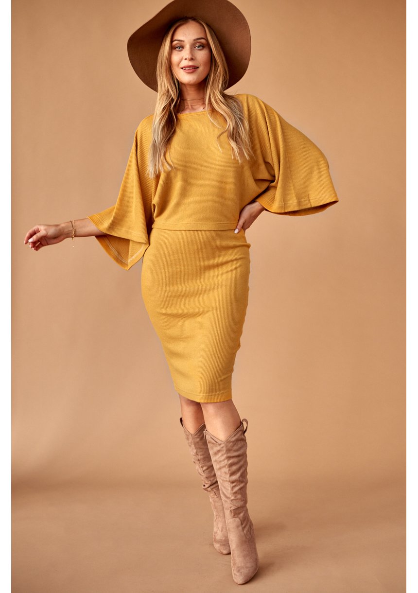 Komplet z dzianiny swetrowej w prążek Musztardowy