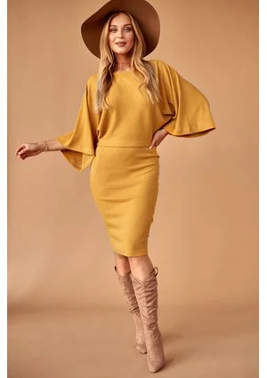 Modna kolorystyka i zachwycający fason to cechy główne seksownego kompletu Mosquito. Atrakcyjna bluzka nietoperz z dopasowaną spódnicą tworzy komplet z dzianiny swetrowej w prążek, który można wykorzystać na wiele okazji. To outfit pasujący na codzienne wyjścia, do pracy i na randkę. Możesz także włożyć go na świąteczne spotkanie z rodziną lub wieczorny wypad ze znajomymi. W stroju projektu Alicja Komar poczujesz się jak gwiazda! Doskonale dobrany materiał pięknie układa się na ciele, podkreślając atuty sylwetki. Elegancka spódnica midi ponętnie eksponuje krągłość pośladków i smukłe nogi. Luźne rękawy bluzki gwarantują maksimum wygody. Tkanina jest przyjemna w dotyku, a jej trwałość pozwala cieszyć się strojem przez długi czas. Odcień musztardowy to prawdziwy hit ostatnich sezonów, więc musztardowy komplet z dzianiny swetrowej perfekcyjnie celuje w aktualne trendy. Daje też wiele możliwości tworzenia własnych kompozycji modowych. Świetnie prezentuje się z żółcią i brązami o dowolnym natężeniu. Chcąc nieco uspokoić wyrazistą stylizację, możesz też dobrać czarne dodatki. Dopasowana spódnica najlepiej połączy się z wysokimi obcasami w postaci czółenek, botków lub lekkich kozaków. W takim stroju zwrócisz na siebie uwagę w każdej sytuacji!