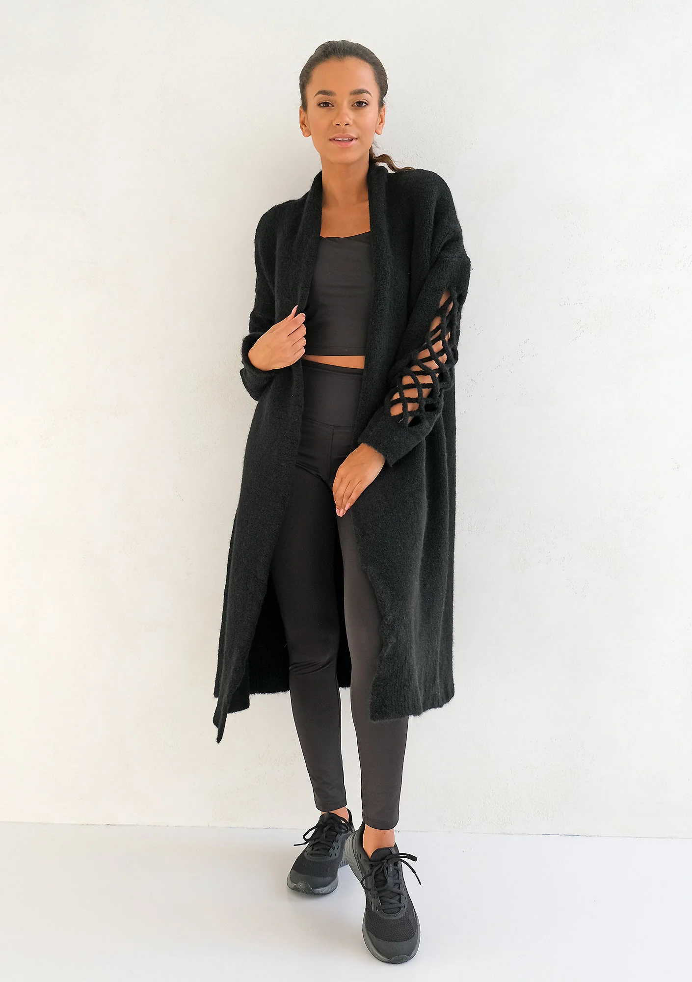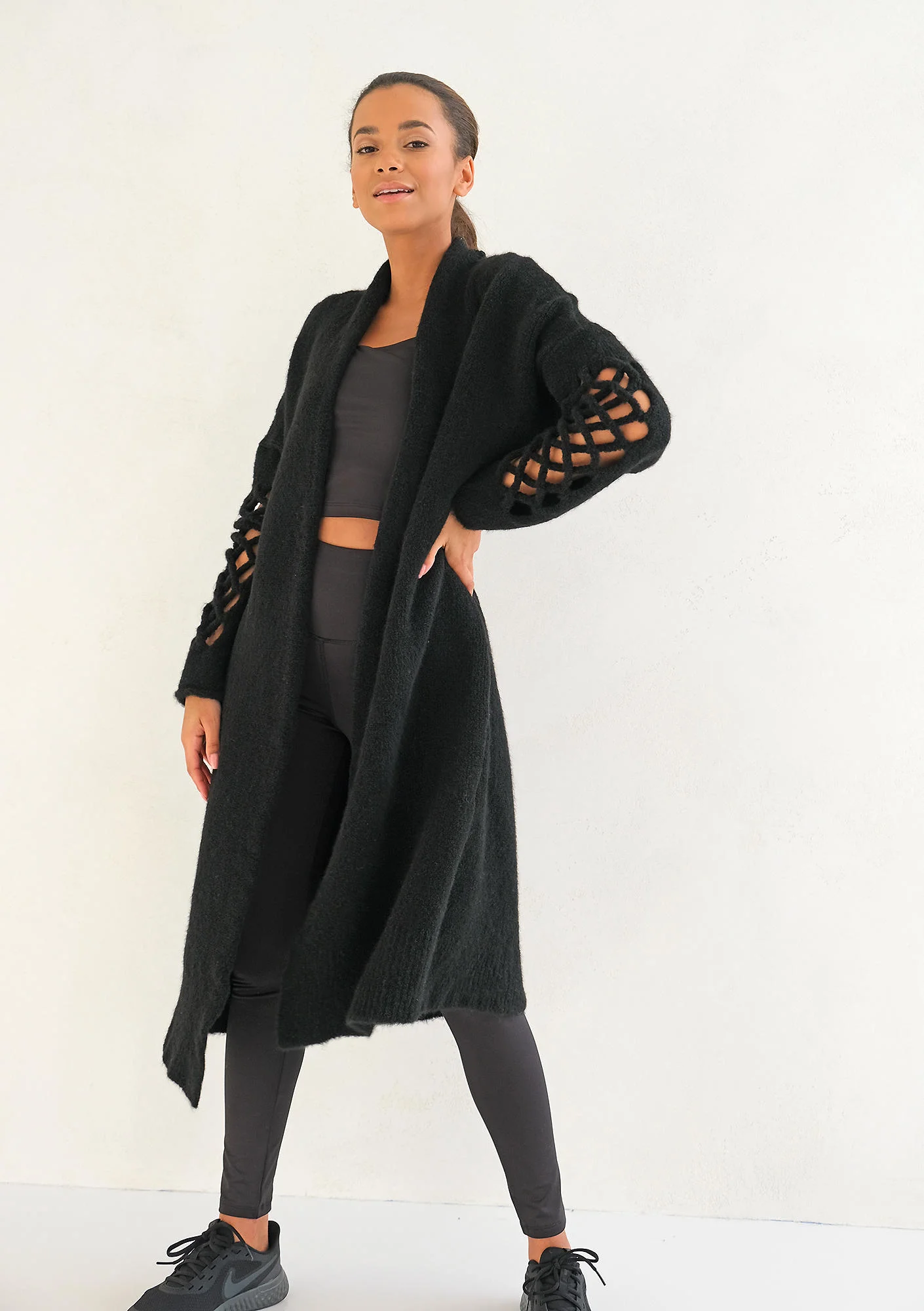 Czarny, długi kardigan z ażurem zapewni Ci uniwersalny, ponadczasowy look, który sprawdzi się niemal w każdej sytuacji. Wiemy, iż w zrównoważonej szafie, oprócz bardzo eleganckich ubrań na specjalne okazje to uniwersalne, wygodne i proste fasony powinny stanowić podstawę. Większość z nas stawia przecież przede wszystkim na dobre samopoczucie i całodzienny komfort. Czarny kardigan damski jest właśnie takim minimalistycznym, użytkowym produktem. Długi, poniżej kolan fason przyjemnie Cię otuli w chłodniejsze dni. Ażurowe, ozdobne sploty na rękawach sprawiają, iż kardigan nabiera unikalnego stylu i wyróżnia się na tle zwyczajnych swetrów. Będzie świetnym uzupełnieniem sukienek, spódnic, jak i przełamie luźny styl dżinsów i legginsów. Czarny kardigan jest dobrym pomysłem na stylizację do pracy – jest stonowany, ale i jednocześnie ociepla wizerunek.