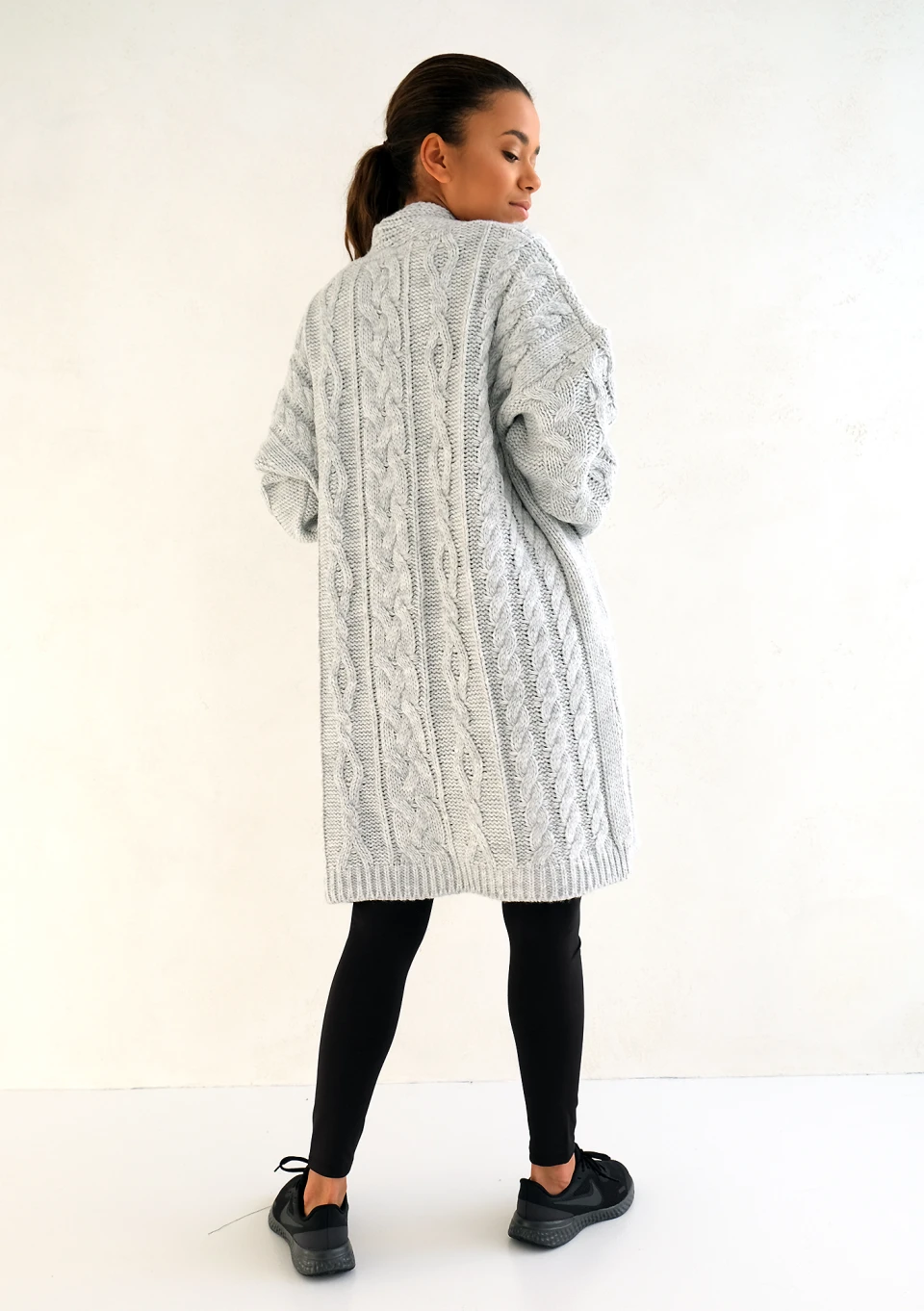 Szary kardigan, który zachwyca bogatością ozdobnych splotów. Model Kalm to fason o długości midi, który możesz wzbogacić dowolnym paskiem. Wykonany z miękkiej dzianiny, posłuży Ci na długo jako elegancki i uniwersalny element.