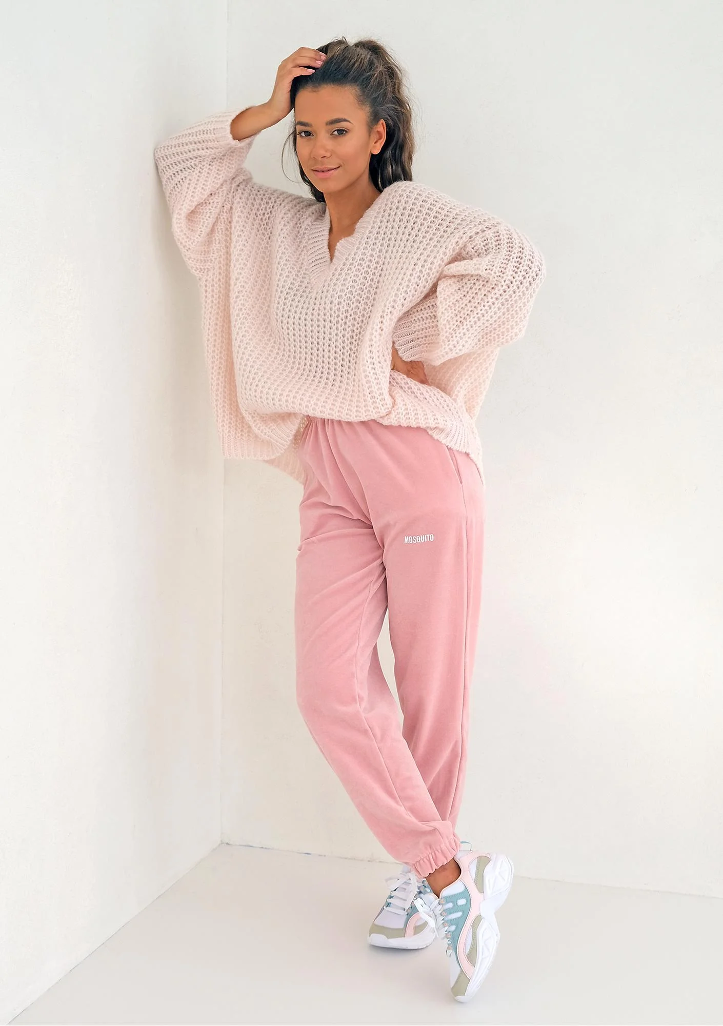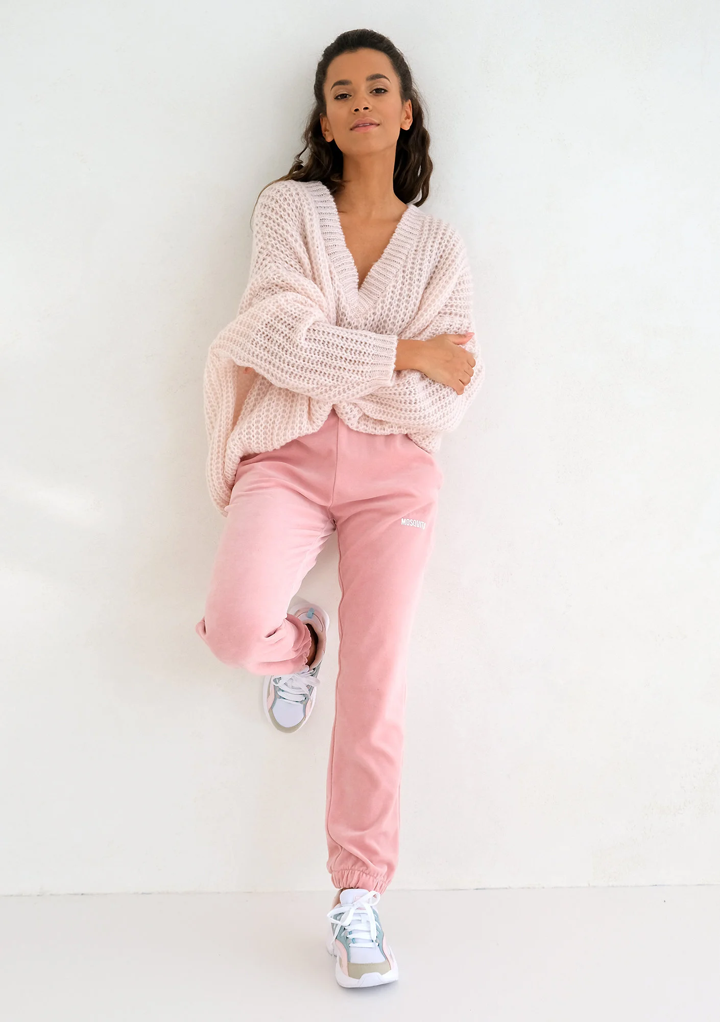 Prezentowany, pudrowy sweter oversize pozwoli Ci wymodelować sylwetkę i nadać jej upragnionych proporcji: W zestawieniu z wąskimi spodniami dresowymi lub legginsami, odwróci uwagę od szerszych bioder, wizualnie powiększając górne partie ciała. Posłuży również kobietom ciężarnym, ze względu na brak jakichkolwiek wyrazistych zwężeń kroju. Pudrowy sweter oversize ma dekolt w kształcie litery V, przez co bardzo ładnie eksponuje okolice szyi i nadaje im lekkości. Dzianina swetra to połączenie funkcjonalnych włókien o różnych właściwościach: akrylu, naturalnej wełny, poliestru i poliamidu. Sweter doskonale się pierze, nie mechaci, ani nie odgniata – bardzo łatwo utrzymasz go w gładkiej formie, pod warunkiem prania w odpowiedniej dla materiału temperaturze.
