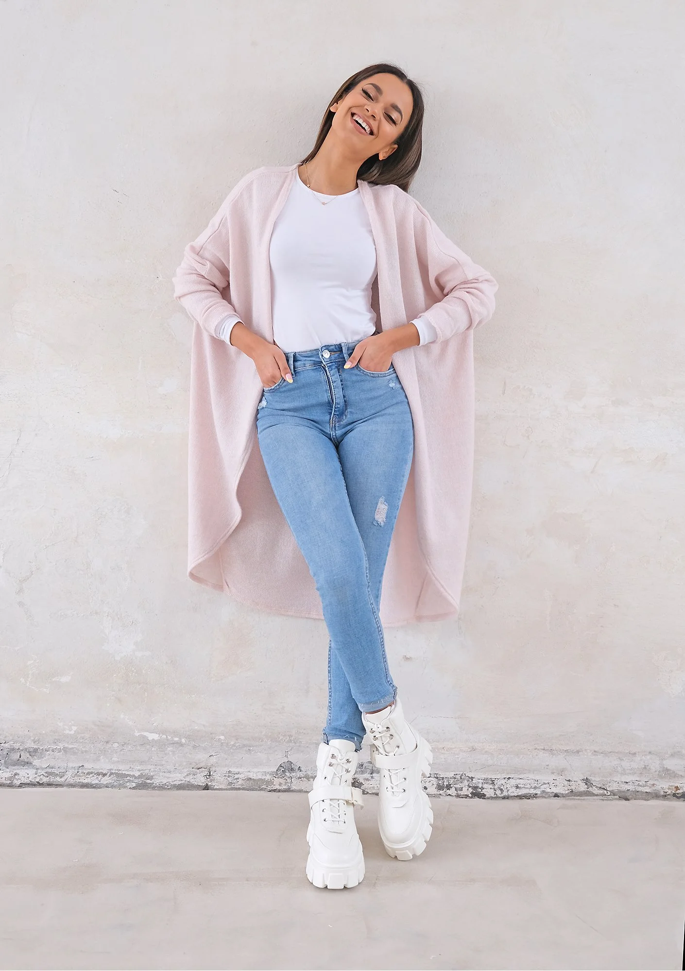 Pudrowa, zwiewna narzutka jest wykonana z prześwitującego akrylu. Materiał ten jest bardzo łatwy w pielęgnacji, nie mechaci się oraz dobrze zastępuje latem dużo cieplejszą od niego wełnę. Uniwersalny rozmiar będzie dobrze leżał na każdym typie sylwetki. Czekamy na Twoje kreatywne stylizacje na Instagramie. Znajdziesz tam mnóstwo inspiracji naszych klientek!