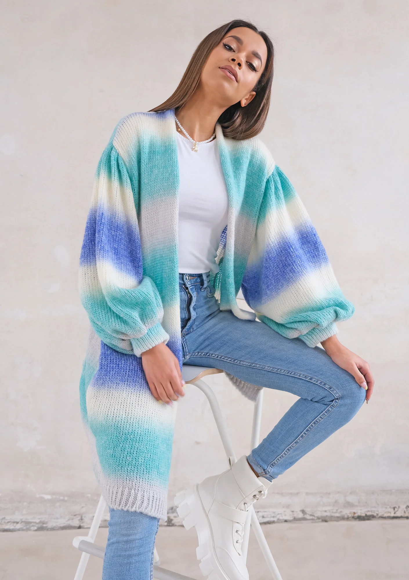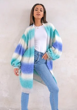Długie kardigany to ubrania o niemal całorocznym zastosowaniu. Przydają się nawet latem, gdy o zmierzchu robi się nieco chłodniej. Wybierając dzianiny swetrowe na cieplejsze pory roku należy kierować się przede wszystkim ich składem. Prezentowany kardigan jest dość ciepły i sprawdzi się najbardziej w porze przejściowej: jest wykonany głównie z akrylu - materiału, który aż tak nie zatrzymuje ciepła jak wełna, choć i ta jest obecna w składzie. Kardigan zatem idealnie sprawdzi się wiosną; przyjemnie ogrzeje także dzięki długim rękawom. Ubranie ma intrygujący, oryginalny fason: zwróć uwagę na efektowne bufki rękawów. Znacznie urozmaicają one krój. Kolorystyka kardiganu składa się z trzech kolorów: bieli, niebieskiego oraz morskiego odcienia błękitu. Kardigan zatem przynosi miłe skojarzenie wakacji i morskich pejzaży wyspiarskiej laguny.