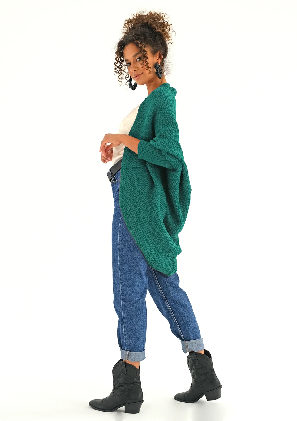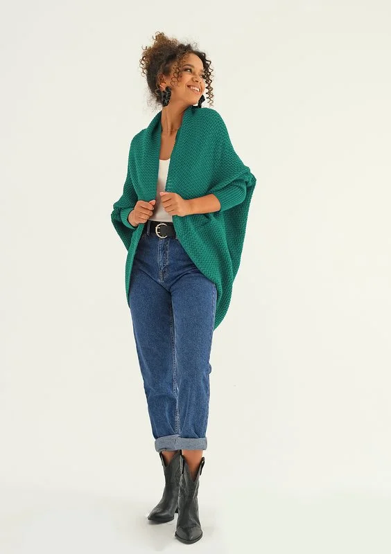 Lekka, uniwersalna narzutka o luźnym kroju oversize. Opada delikatnie na sylwetce i ożywia elegancką, szmaragdową zielenią. Idealny model do okrycia się w chłodne dni o każdej porze roku.