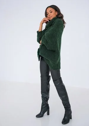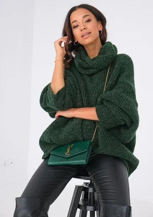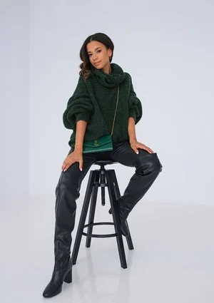 Swetry damskie są nieodłącznym elementem szafy jesienno-zimowej każdej kobiety. Sweter z golfem to klasyka, która nigdy nie wychodzi z mody. Ten model jednak zdecydowanie wyróżni Cię w tłumie. Jego przepiękny ciemnozielony kolor nie pozostanie niezauważony. Luźne rękawy można podciągnąć w górę, by nadać całej stylizacji jeszcze więcej wyrazu. Luźny golf otuli Twoją szyję. Sweter idealnie sprawdzi się w stylizacji codziennej, ale i wyjściowej, zarówno do butów sportowych, jak i botków czy kozaków. Jego uniwersalny oversizowy krój sprawia, że nadaje się on dla kobiet o różnym wzroście i sylwetce. Znajdziesz go także w kolorze malinowym, brązowym, beżowym i kobaltowym. Sweter z golfem wykonany jest z przyjemnego w dotyku akrylu, który znakomicie grzeje, ale w przeciwieństwie do wełny nie powoduje alergii ani podrażnień i świądu skóry. Jest łatwy w pielęgnacji, nie ulega uszkodzeniom ani odkształceniom podczas prania w pralce.