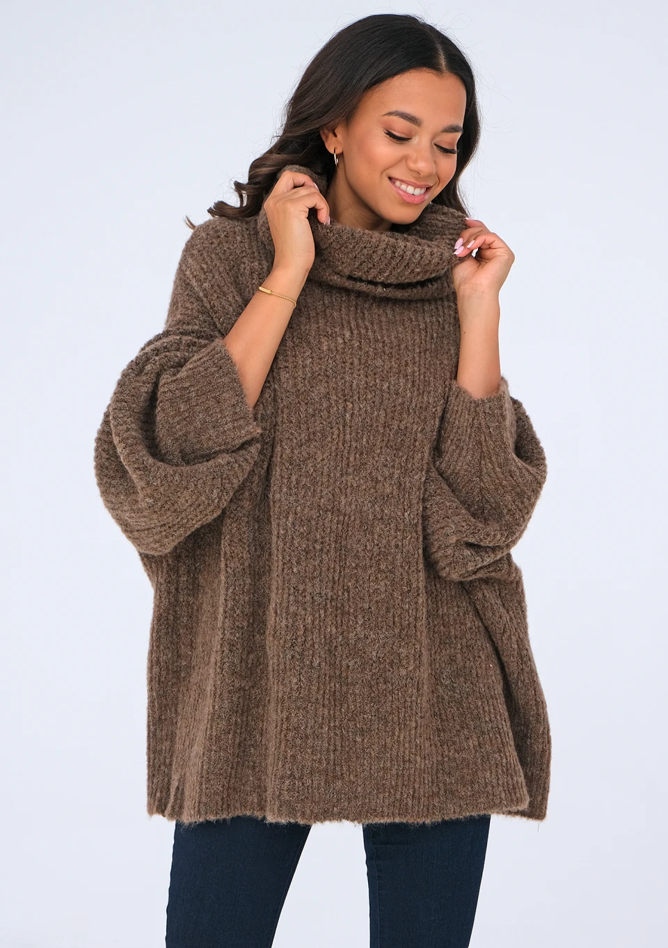 Sweter o wygodnym i modnym w każdym sezonie fasonie oversize. Posiada miękko otulający szyję golf i długie, luźne rękawy. Wykonany z brązowej, miłej dzianiny, może stanowić świetną bazę do zimowych stylizacji.
