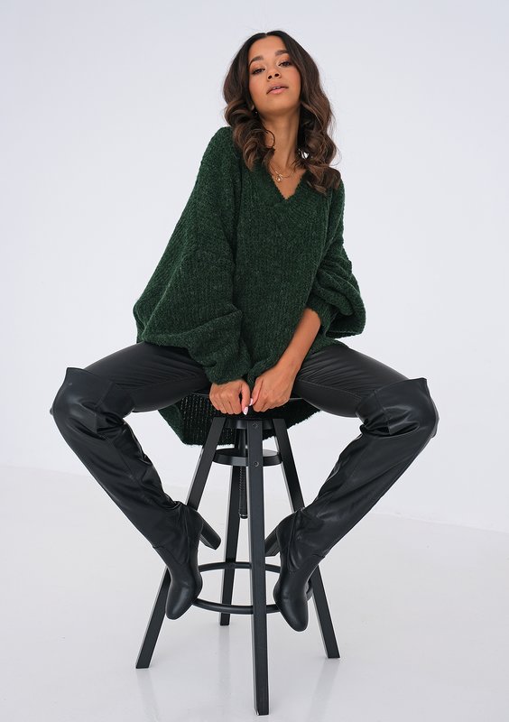 Swobodny i bardzo ciepły sweter oversize, dzięki któremu wzbogacisz swoje zimowe stylizacje i bez trudu dobierzesz pozostałe elementy. Model w eleganckim kolorze butelkowej zieleni, wykonany z miłej w dotyku, lekkiej dzianiny.