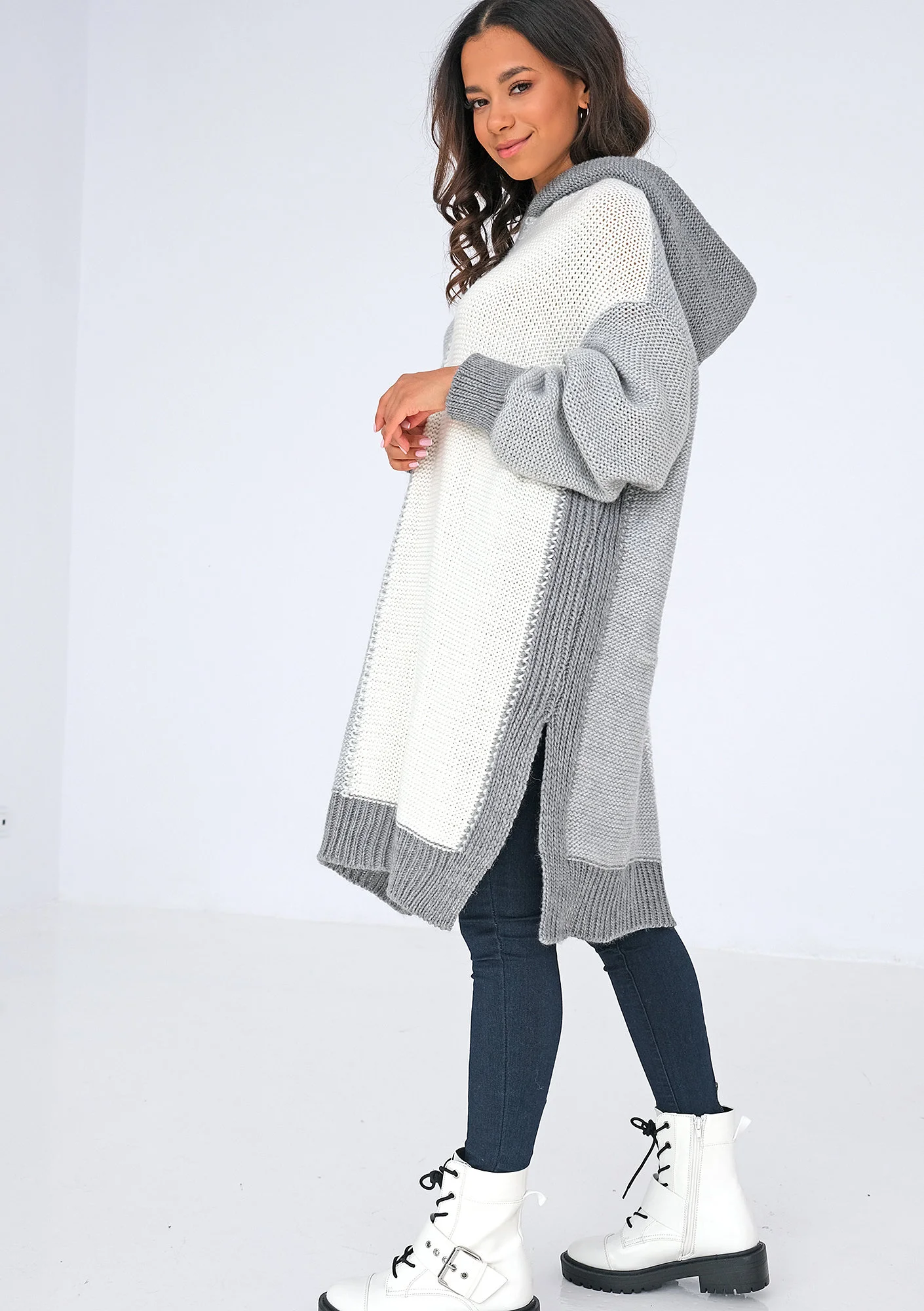 Nietuzinkowy sweter oversize w uniwersalnym rozmiarze, ogrzeje Cię w zimne wieczory i oczaruje minimalistycznym stylem. Nowoczesny krój w połączeniu z efektowną grą odcieni szarości, tworzą doskonałą bazę do wielu codziennych stylizacji. Długość swetra została wybrana z myślą o różnorodności kobiecych sylwetek, sweterek będzie świetnie prezentować się na Tobie, niezależnie od wzrostu! Dzięki przemyślanemu, stylowemu kapturowi, poczujesz się w pełni otulona miękką dzianiną i nie zmarzniesz nawet w najzimniejszy dzień!