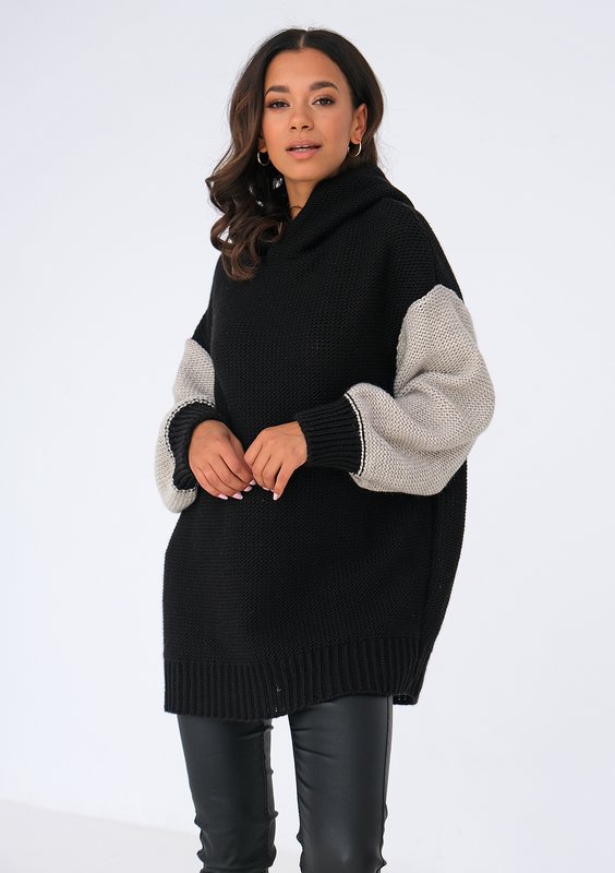 Wygodny, luźny sweter z kapturem, złożony z czerni i beżu. Model o bardzo wszechstronnym zastosowaniu, pasujący do wszystkiego. Dzięki dodatkowi wełny przyjemnie ciepły.