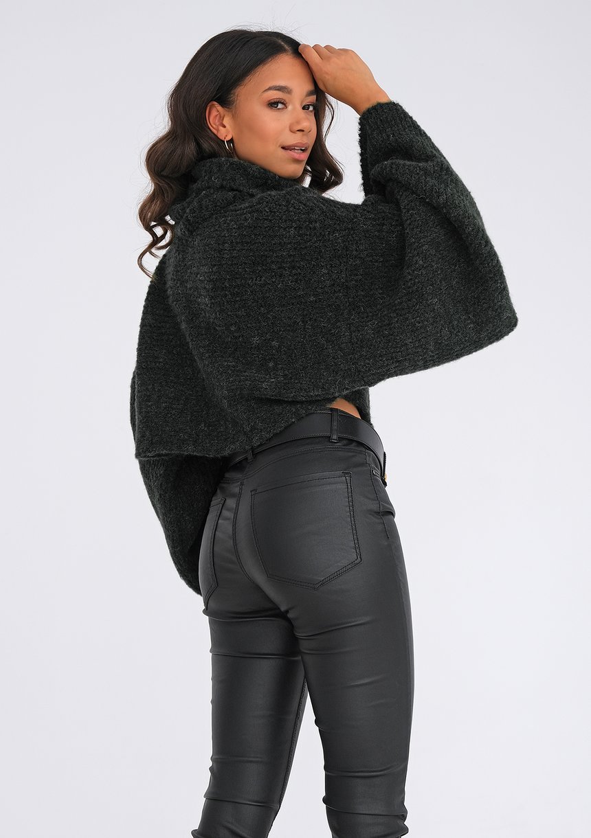 Wyjątkowy sweter z wygodnym golfem o efektownej formie bardzo luźnych rękawów. Model wykonany w uniwersalnym, czarnym kolorze z ciepłej i miłej w dotyku dzianiny zawierającej wełnę.