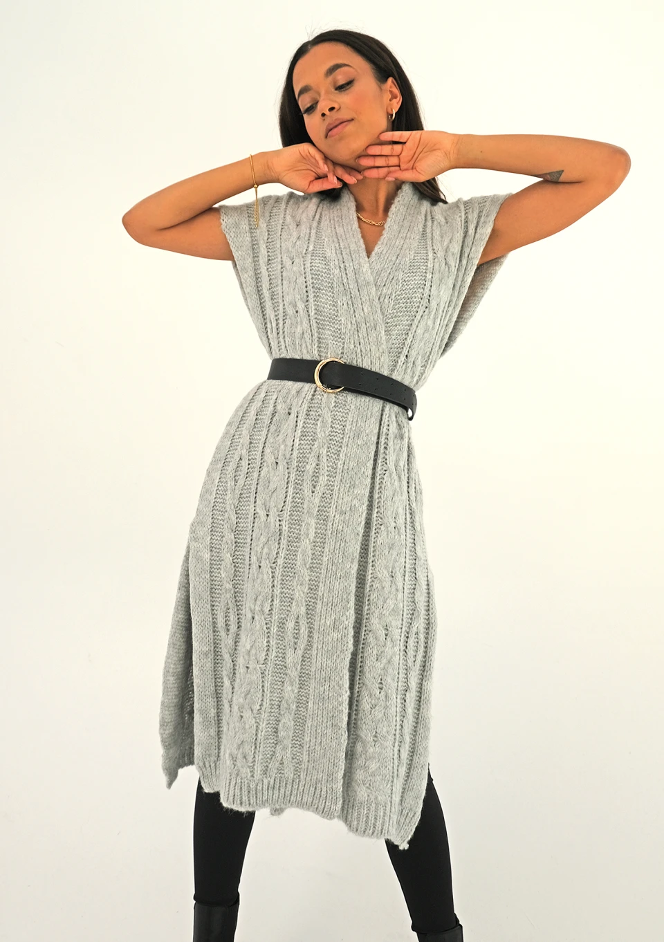 Lekki, dzianinowy bezrękawnik w delikatnym, szarym kolorze. To model pełen dopracowanych, ozdobnych splotów, który wspaniale wzbogaci zimowe stylizacje.