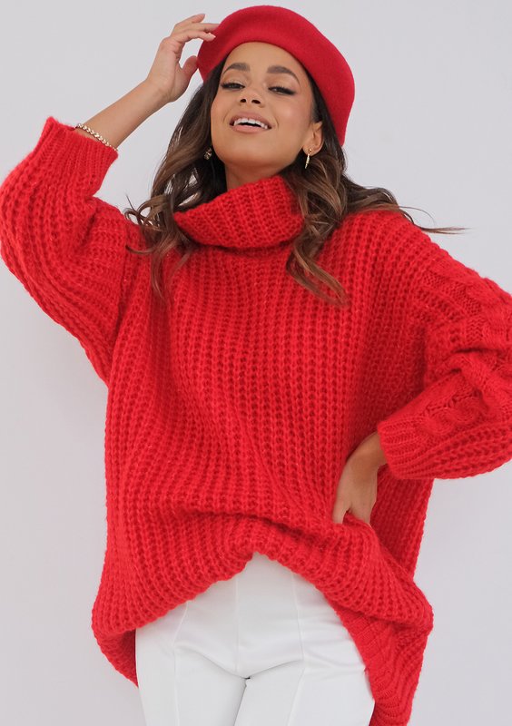 Dziany sweter w stylu oversize, z cudnym splotem kłosów wzdłuż rękawów i szerokim golfem. Lekki i ciepły, w kobiecym odcieniu intensywnej czerwieni. Znakomity akcent prostych, codziennych stylizacji.