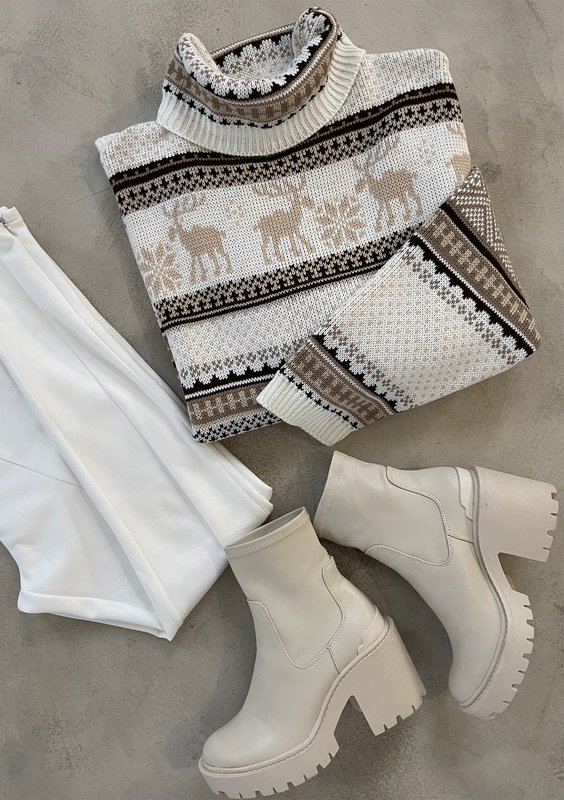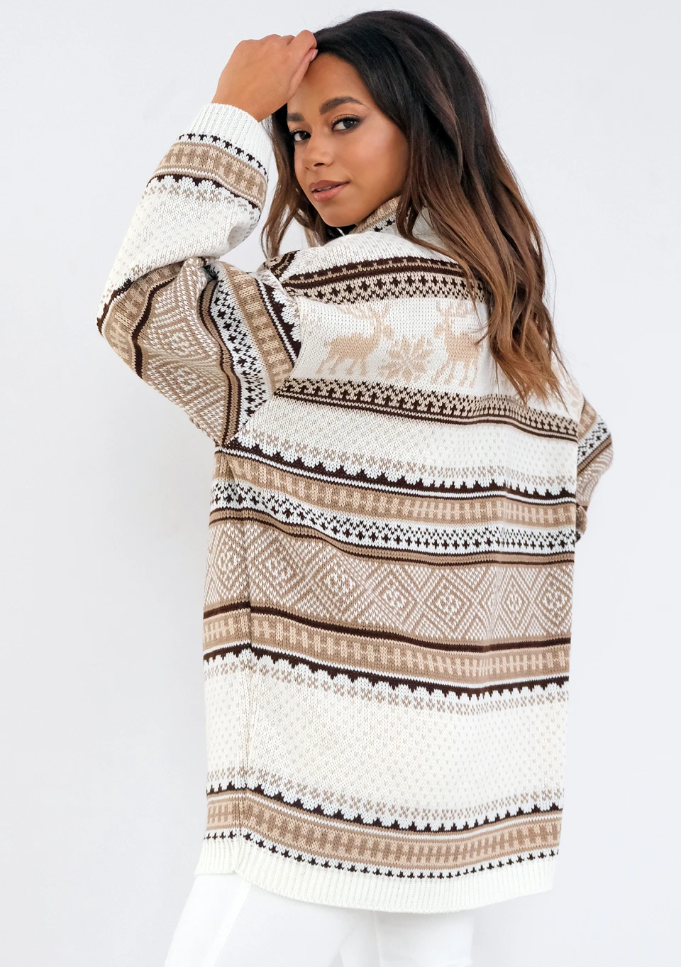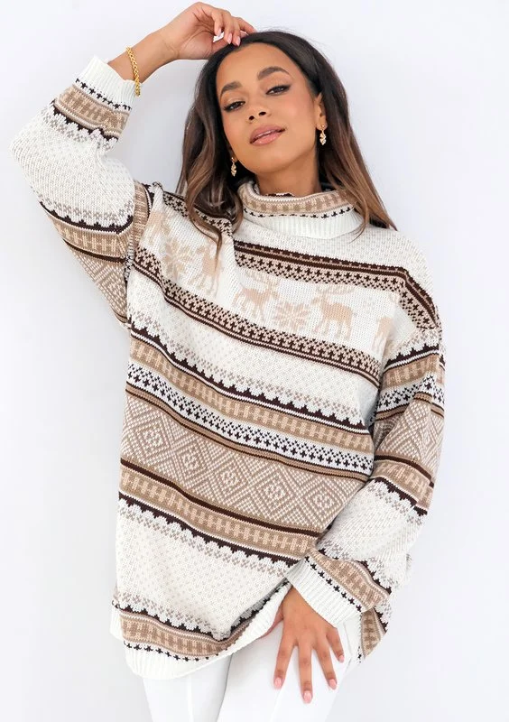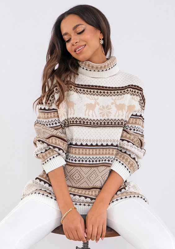Ciepły sweter damski z golfem o wygodnym kroju oversize. Ozdobiony wyjątkowo pięknym, zimowym motywem, dopracowany w każdym detalu.