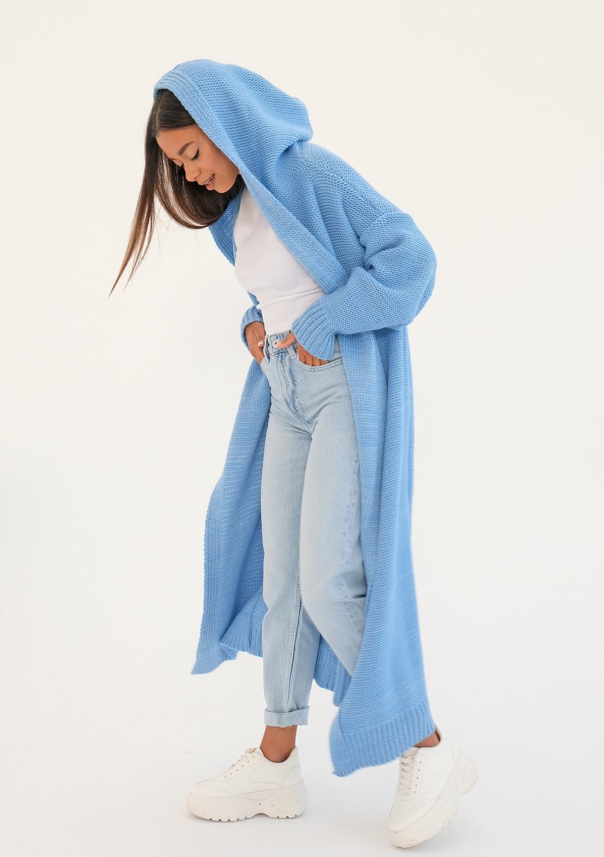 Długi kardigan damski w wygodnie luźnej formie otuli Cię ciepłą i miękką dzianiną, która zawiera wełnę. To praktyczny fason z kapturem, wykonany w jasnym, błękitnym kolorze. Doskonale sprawdzi się w chłodniejsze dni wiosny i letnie wieczory.