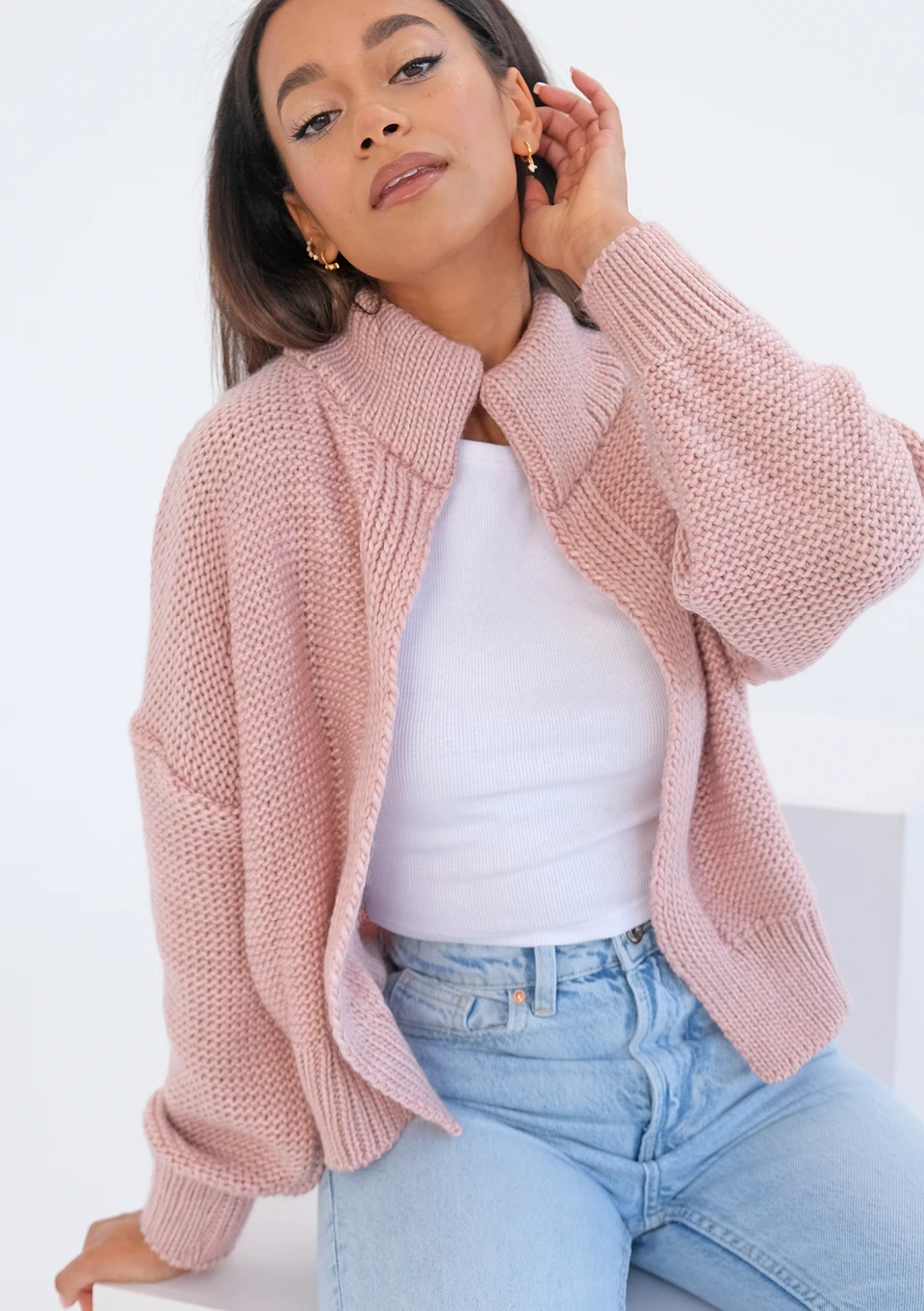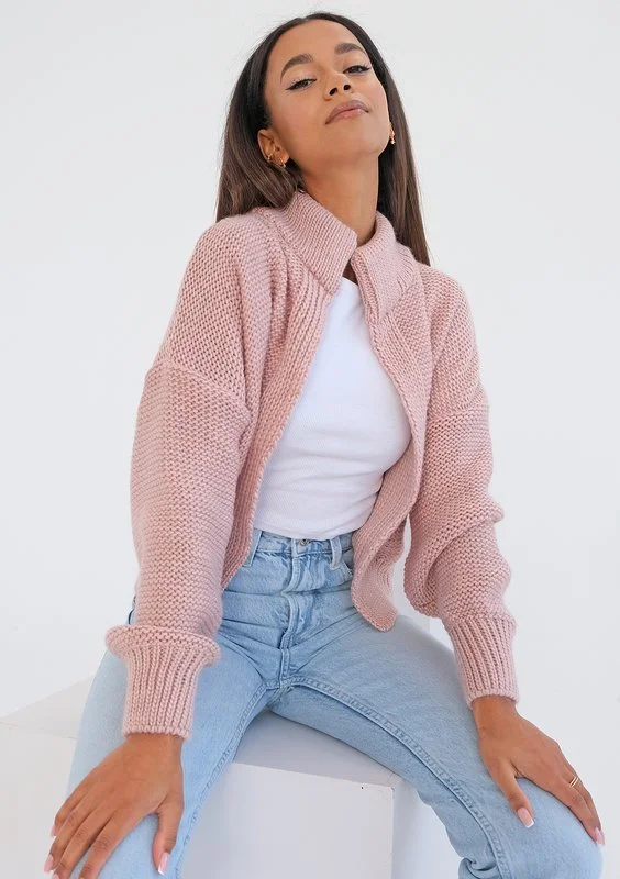 Różowy kardigan o krótkim fasonie, klasycznym splocie i z wysokim kołnierzem uzupełni codzienny look. To wszechstronny, bardzo wygodny sweterek damski z miękkiej dzianiny, która nie uczula ani nie podrażnia.
